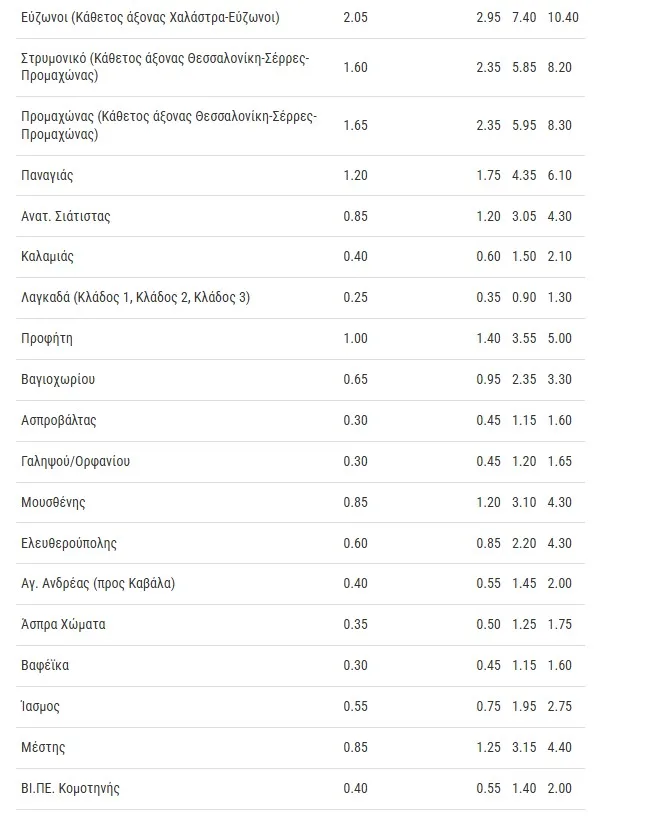 Στα πλευρικά διόδια, στον σταθμό Ανατολικής Σιάτιστας από 0,95 ευρώ (για ΙΧ επιβατικό) ανεβαίνει στα 1,20 ευρώ. Στην Καλαμιά από 0,45 ευρώ (για ΙΧ) ανεβαίνει στα 0,60 ευρώ.