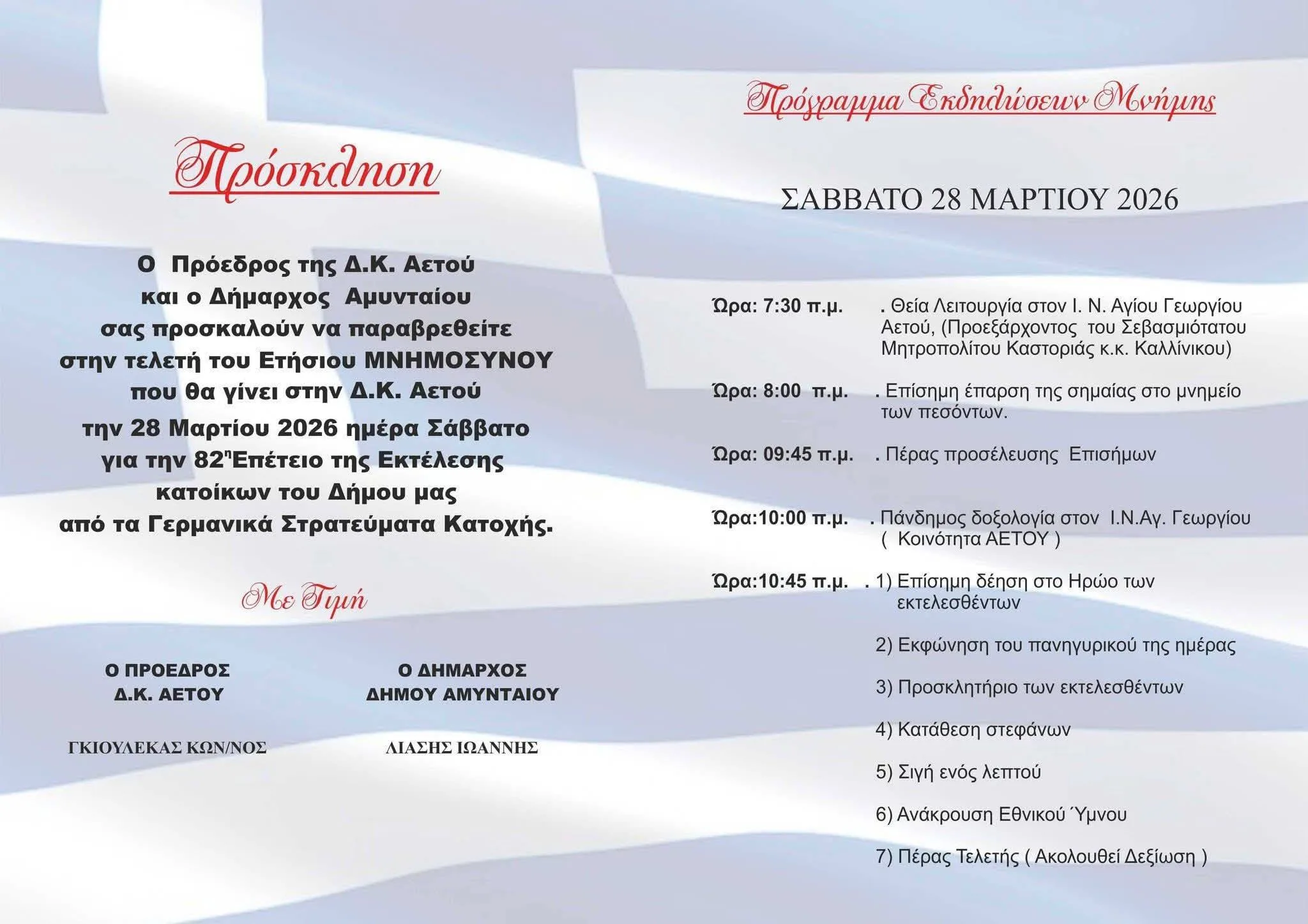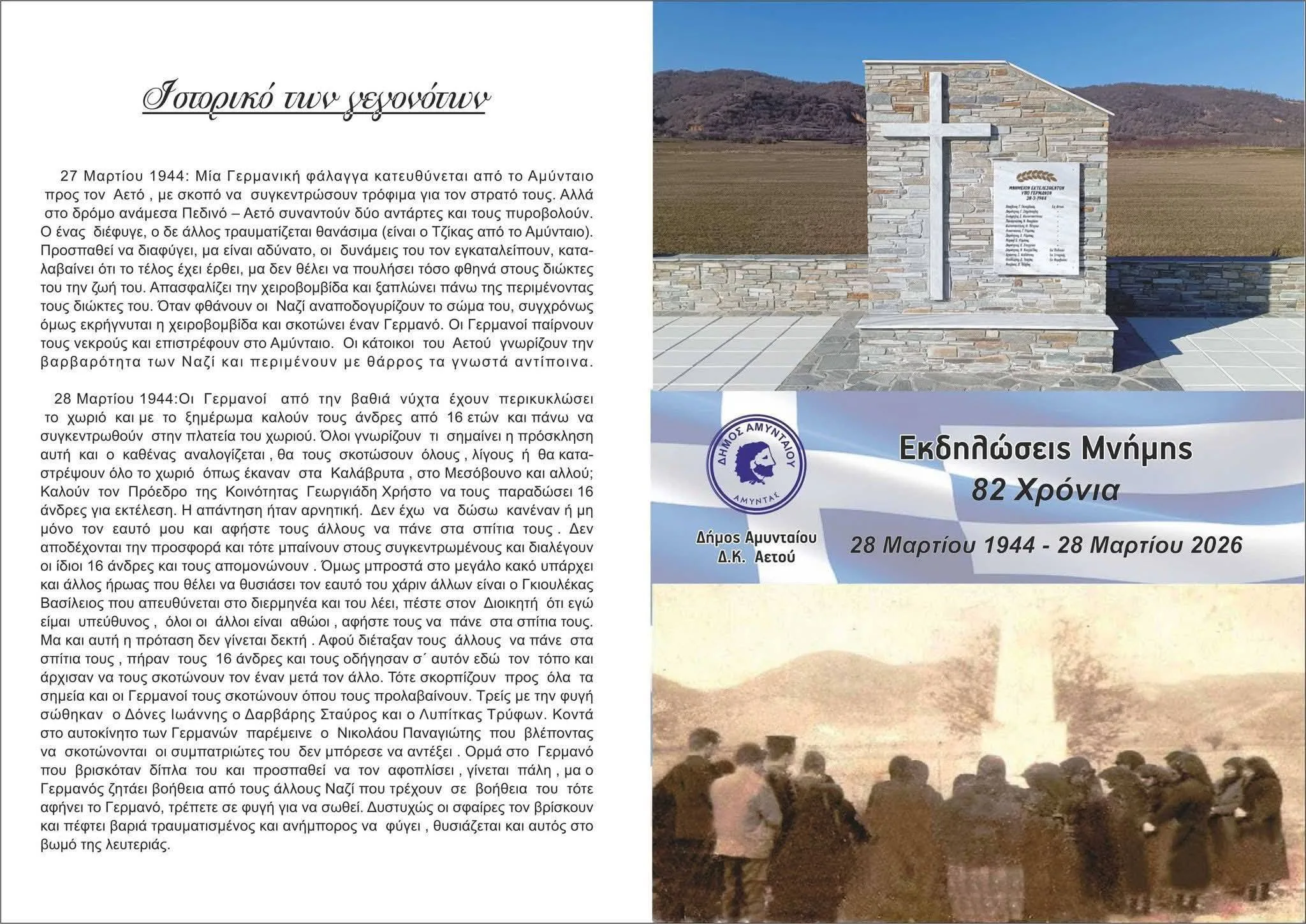 Εκδηλώσεις μνήμης θα πραγματοποιηθούν στην Τοπική Κοινότητα Αετού Αμυνταίου, το Σάββατο 28 Μαρτίου, για την 82η επέτειο της Εκτέλεσης των κατοίκων του Δήμου, από τα Γερμανικά στρατεύματα κατοχής.