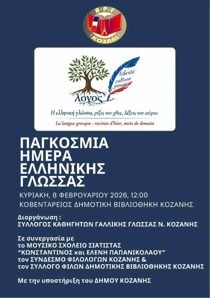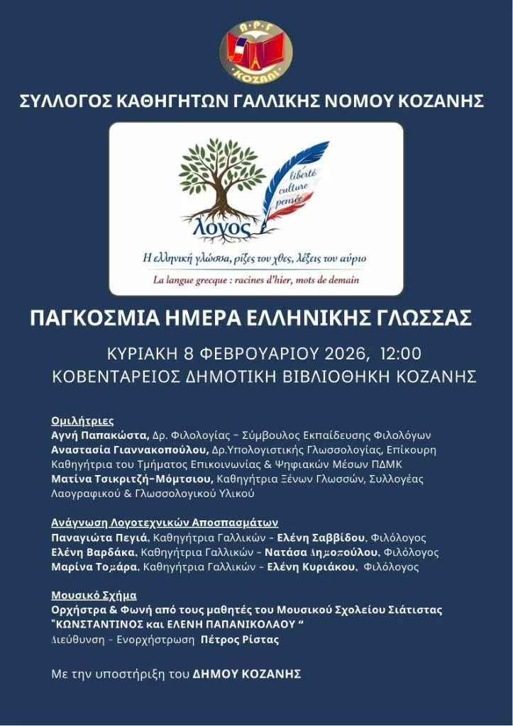 Με αφορμή την Παγκόσμια Ημέρα Ελληνικής Γλώσσας, ο Σύλλογος Καθηγητών Γαλλικής Γλώσσας Νομού Κοζάνης διοργανώνει ειδική εκδήλωση την Κυριακή 8 Φεβρουαρίου 2026, στις 12:00 το μεσημέρι, στην Κοβεντάρειο Δημοτική Βιβλιοθήκη Κοζάνης.