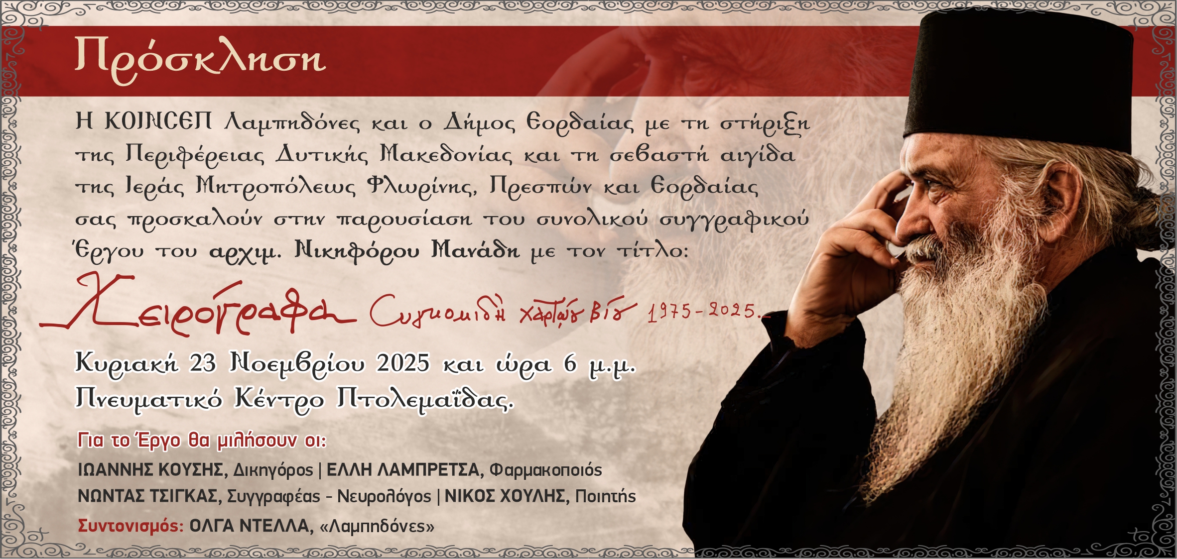 Για το σύνολο του πολυσχιδούς και πολύτιμου Έργου του η ΚΟΙΝΣΕΠ Λαμπηδόνες σε συνεργασία με τον Δήμο Εορδαίας, τη στήριξη της Περιφέρειας Δυτικής Μακεδονίας, τη σεβαστή αιγίδα της Ιεράς Μητροπόλεως Φλωρίνης, Πρεσπών και Εορδαίας, θέλησε να εορτάσει τη σύναξη του Έργου του με το αίσθημα της ευθύνης απέναντι στη φανέρωση και μεταλαμπάδευσή του στους νεότερους. Κυρίως όμως, με βαθιά αίσθηση ευγνωμοσύνης, οφειλής και συγκίνησης για την ύπαρξή του.