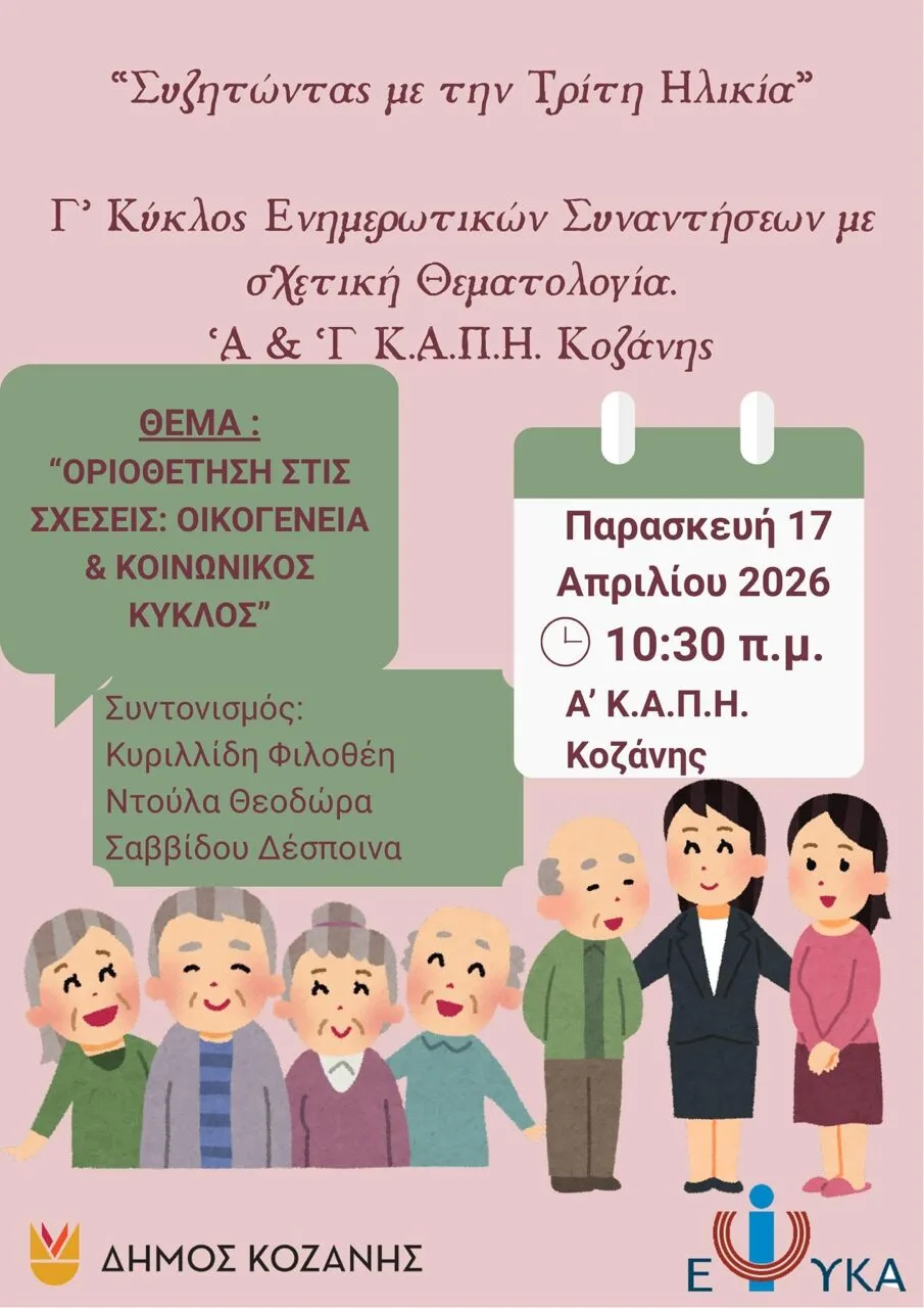 Σε ενημερωτική εκδήλωση με θέμα «Οριοθέτηση στις σχέσεις: Οικογένεια και κοινωνικός κύκλος» προσκαλεί το κοινό το 1ο ΚΑΠΗ του Δήμου Κοζάνης, σε μια δράση που επικεντρώνεται σε ζητήματα καθημερινής επικοινωνίας και διαχείρισης των διαπροσωπικών σχέσεων.