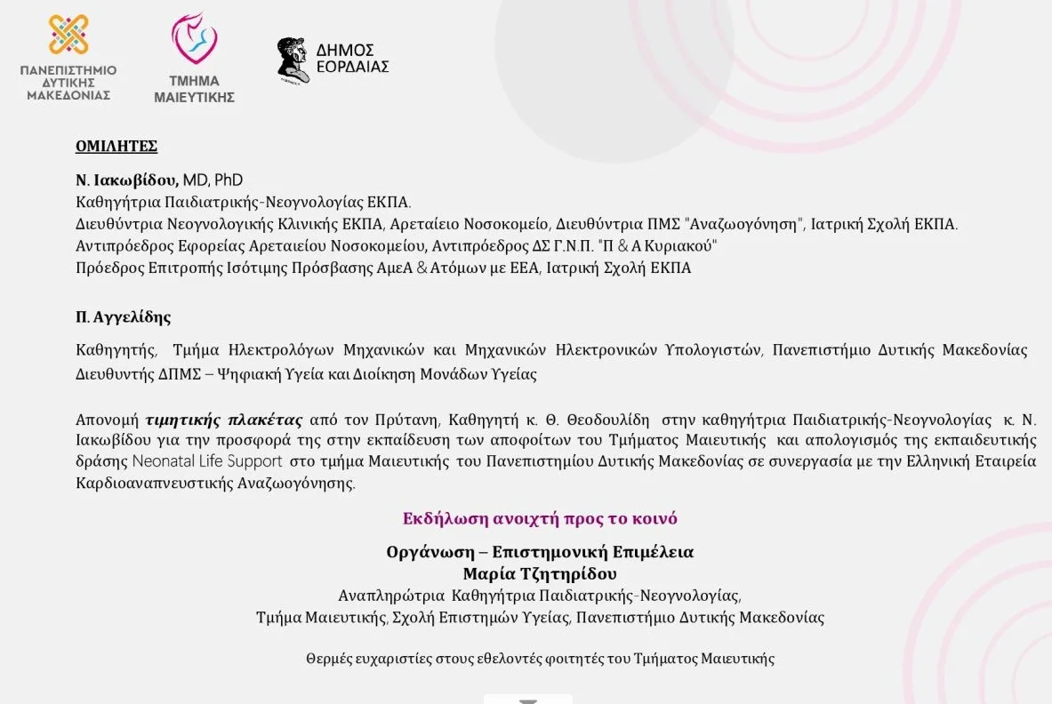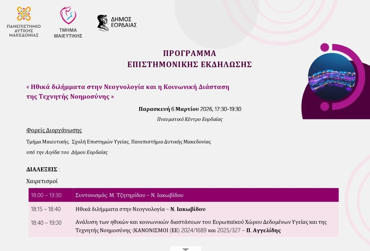 Το Τμήμα Μαιευτικής διοργανώνει την Παρασκευή 6 Μαρτίου 2026 επιστημονική  εκδήλωση με τίτλο «Από τη Βιοηθική στην Τεχνητή Νοημοσύνη», η οποία θα πραγματοποιηθεί στο Πνευματικό Κέντρο Εορδαίας και ώρα 17.30-20:00 μμ.