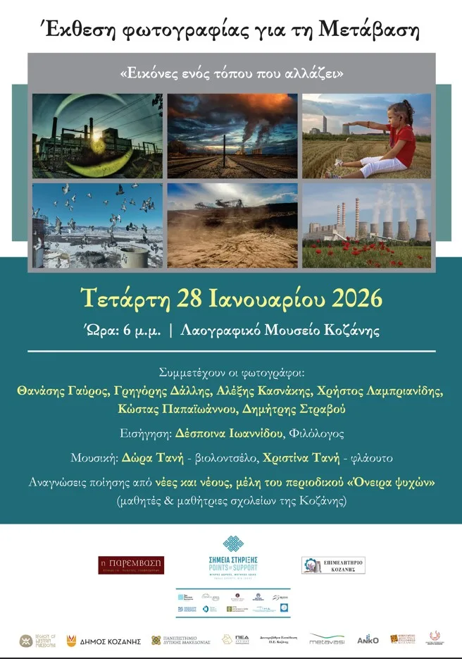 Έκθεση φωτογραφίας για τη Μετάβαση, με τίτλο «Εικόνες ενός τόπου που αλλάζει» πρόκειται να πραγματοποιηθεί την Τετάρτη 28 Ιανουαρίου, ώρα 6 μ.μ. στο Λαογραφικό Μουσείο Κοζάνης. Συμμετέχουν οι φωτογράφοι: Θανάσης Γαύρος, Γρηγόρης Δάλλης, Αλέξης Κασνάκης, Χρήστος Λαμπριανίδης, Κώστας Παπαιωάννου, Δημήτρης Στραβού.
