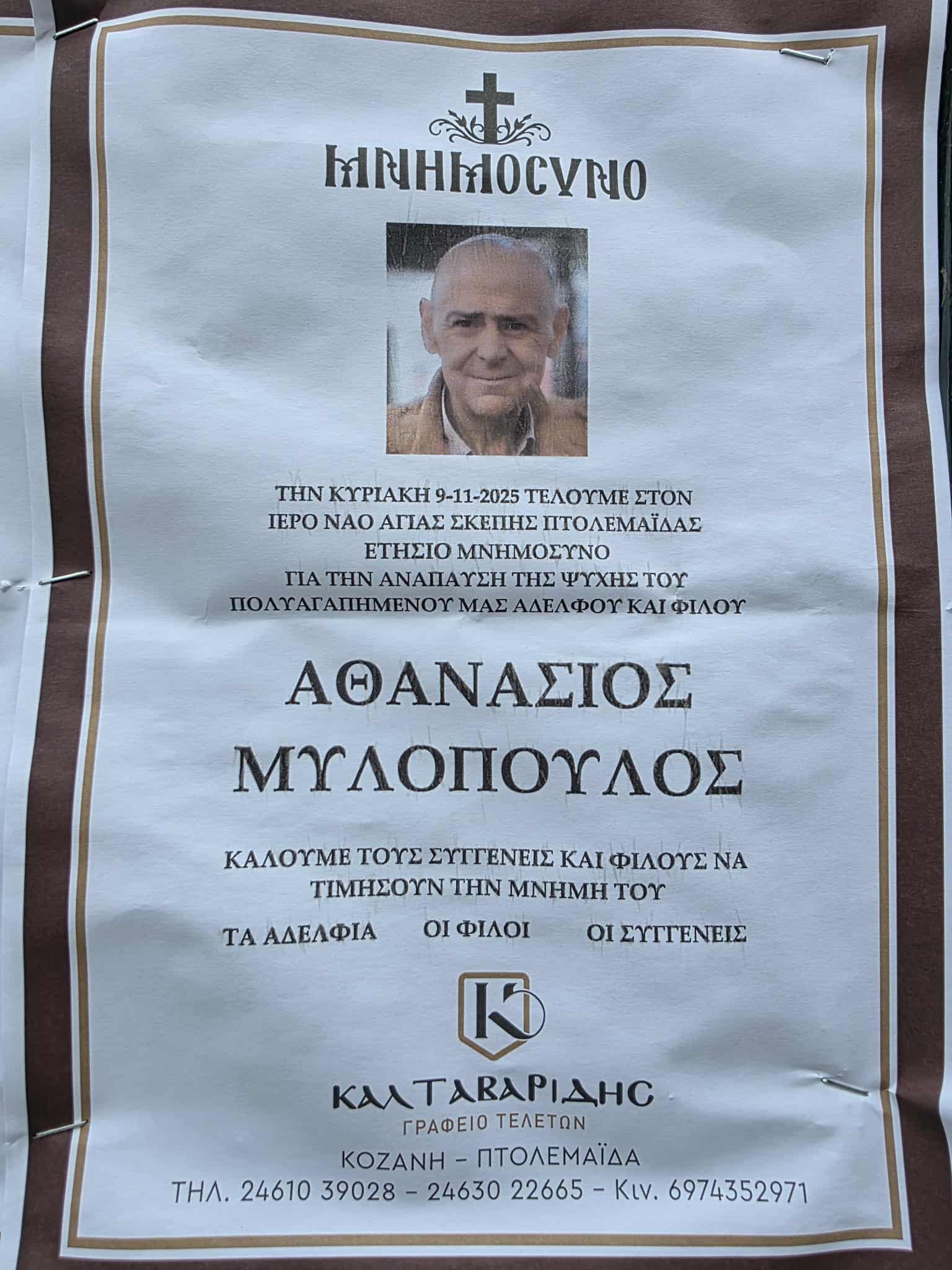Το ετήσιο Μνημόσυνο θα πραγματοποιηθεί την Κυριακή 9 Νοεμβρίου 2025 στον Ιερό Ναό Αγίας Σκέπης Πτολεμαΐδας, τιμώντας τη μνήμη και το έργο του.