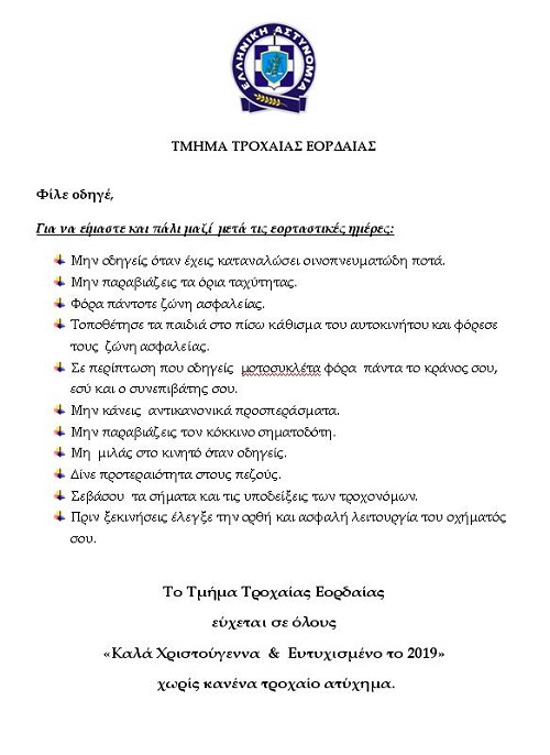 Ενημερωτικά φυλλάδια διανεμήθηκαν προχθές (21-12-2018) από αστυνομικούς του Τμήματος Τροχαίας Εορδαίας, σε οδηγούς και συνοδηγούς στην πόλη της Πτολεμαΐδας, που περιείχαν συμβουλές για την ασφαλή μετακίνηση των οδηγών τις εορταστικές αυτές ημέρες, ενόψει των εορτών των Χριστουγέννων, της Πρωτοχρονιάς και των Θεοφανείων.