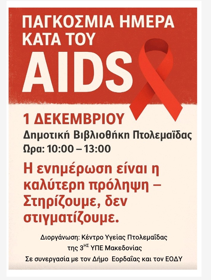 Ενημερωτική εκδήλωση με αφορμή την Παγκόσμια Ημέρα κατά του AIDS από το Κ.Υ. Πτολεμαΐδας τη Δευτέρα 1/12