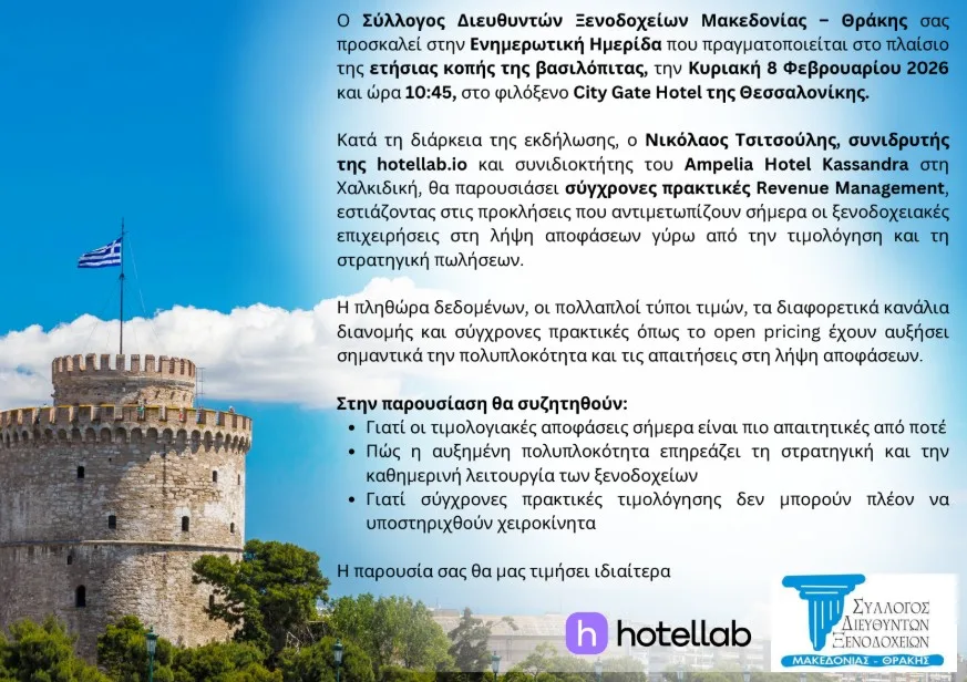Πριν την κοπή της Βασιλόπιτας θα πραγματοποιηθεί ενημερωτική ημερίδα από τον κ. Νικόλαο Τσιτσούλη Co-Founder hotellab.io με θέμα «Νέες Πρακτικές Revenue Management Προκλήσεις και στρατηγικές στη λήψη αποφάσεων τιμολόγησης και πωλήσεων για ξενοδοχειακές επιχειρήσεις».