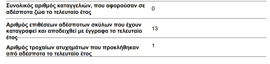 Το τελευταίο έτος καταγράφηκαν (και αποδείχθηκαν με έγγραφα) με βάση τα όσα αναφέρονται, 13 επιθέσεις από αδέσποτα ζώα, ενώ προκλήθηκε 1 τροχαίο ατύχημα από αδέσποτο. Σημειώνεται, δε, πως ο αριθμός των επιθέσεων αφορά σε γνωματεύσεις που έχουν δοθεί από νοσοκομεία ότι ο τραυματισμός οφείλεται σε «δείγμα κυνός». Χωρίς να περιλαμβάνονται οι καταγγελίες πολιτών που αφορούν σε εκδήλωση επιθετικής συμπεριφοράς και πρόκληση φόβου για σωματική ακεραιότητα (για τις οποίες το αστυνομικό τμήμα ζητά επίσης την περισυλλογή των ζώων).