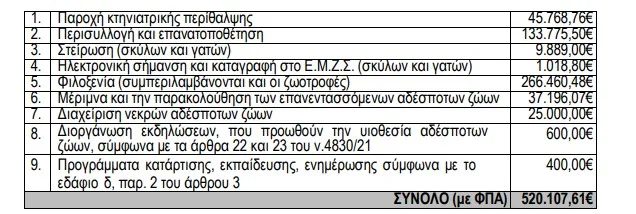 Το ποσό των 520.107,61€, συµπεριλαµβανοµένου ΦΠΑ, αφορά αναλυτικότερα στα εξής: το Παροχή κτηνιατρικής περίθαλψης 45.768 ευρώ, περισυλλογή και επανατοποθέτηση 133.775 ευρώ, στείρωση σκύλων και γατών 9.889 ευρώ, ηλεκτρονική σήμανση 1.018 ευρώ, φιλοξενία και ζωοτροφές 266.460 ευρώ, μέριμνα για την παρακολούθηση των επανεντασσόμενων ζώων 37.196 ευρώ, διαχείριση νεκρών αδέσποτων ζώων 25.000 ευρώ, διοργάνωση εκδηλώσεων 600 ευρώ και πρόγραμμα κατάρτισης – εκπαίδευσης 400 ευρώ.