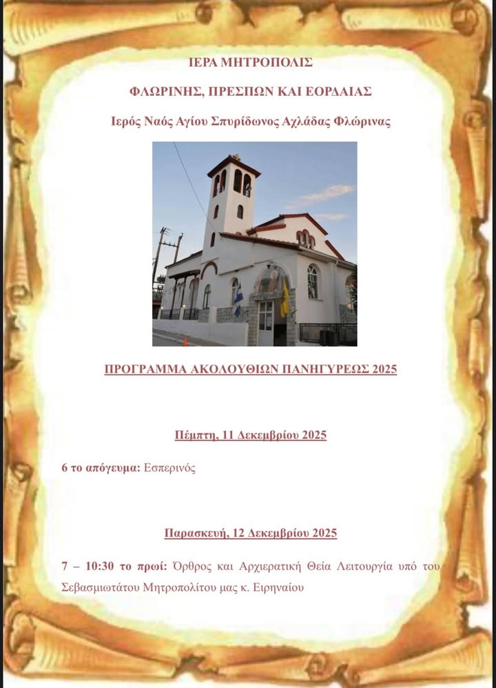 Η Ιερά Μητρόπολη Φλωρίνης, Πρεσπών και Εορδαίας γνωστοποιεί το πρόγραμμα της πανήγυρης του Αγίου Σπυρίδωνος στον ενοριακό ναό της Αχλάδας Φλώρινας. Οι εκδηλώσεις θα ξεκινήσουν την Πέμπτη 11 Δεκεμβρίου 2025, στις 6 το απόγευμα, με την τέλεση εσπερινού.