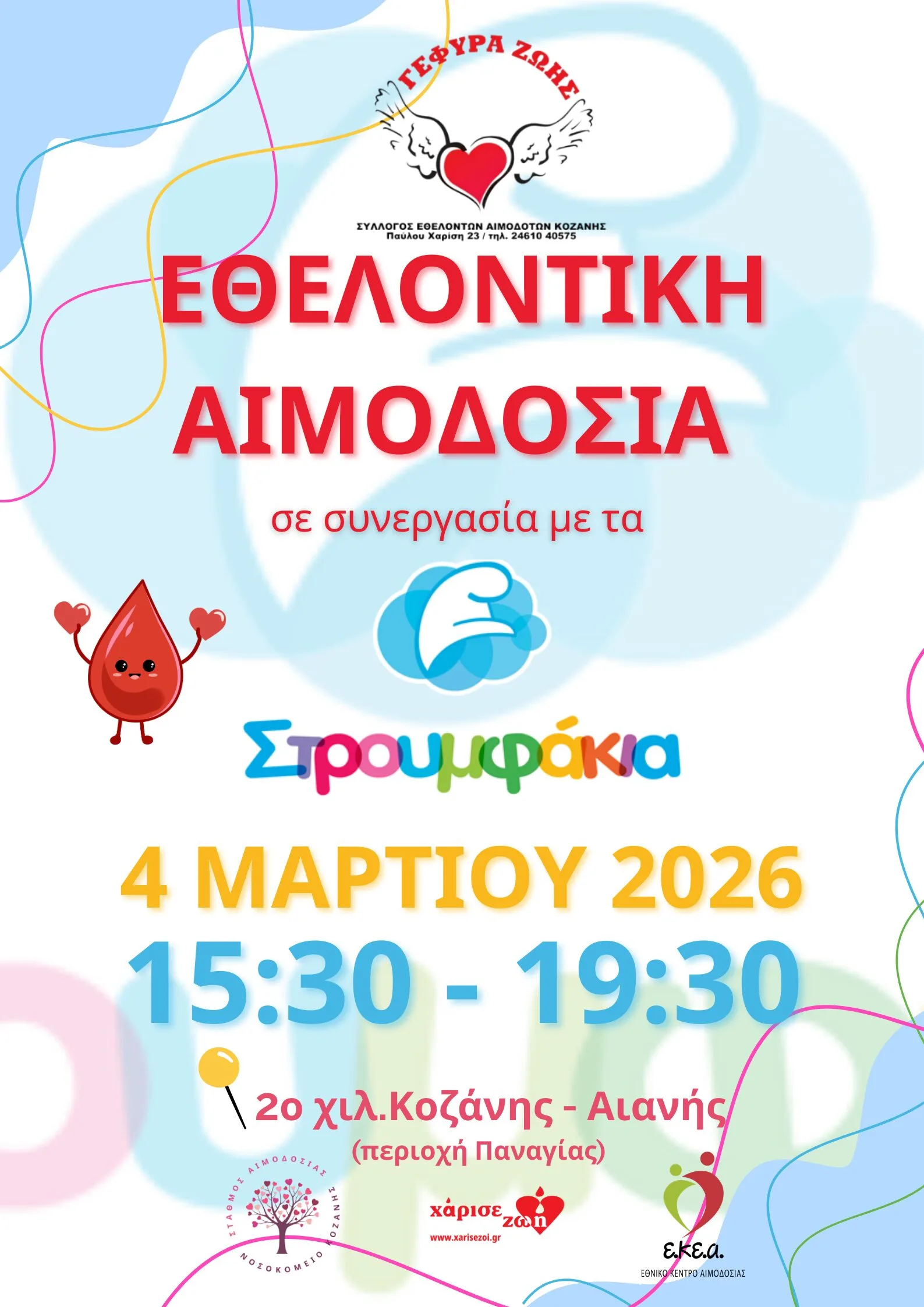 Την Τετάρτη 4 Μαρτίου 2026, από τις 15:30 έως τις 19:30, o Σύλλογος Εθελοντών Αιμοδοτών Κοζάνης «ΓΕΦΥΡΑ ΖΩΗΣ» σας προσκαλεί να συμμετάσχετε στην εθελοντική αιμοδοσία που πραγματοποιείται σε συνεργασία με τον Παιδικό Σταθμό – Νηπιαγωγείο «Στρουμφάκια», στο 2ο χλμ. Κοζάνης–Αιανής, και με την υποστήριξη του Τμήματος Αιμοδοσίας του Μαμάτσειου Νοσοκομείου Κοζάνης.