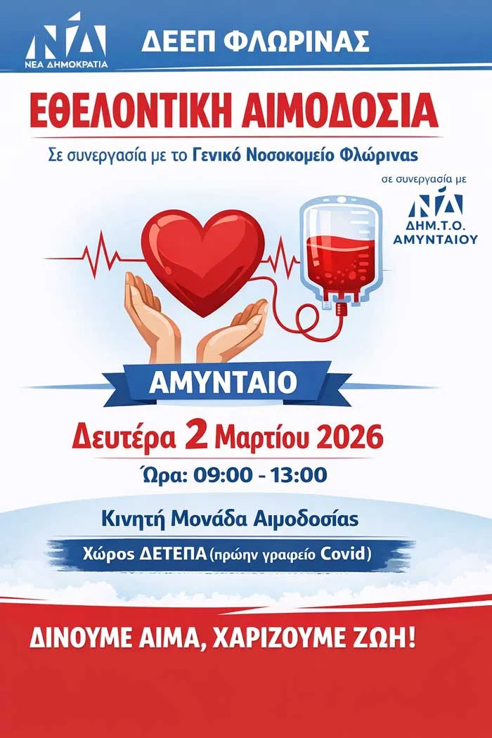 Εθελοντική αιμοδοσία θα πραγματοποιήσει η ΔΕΕΠ Φλώρινας σε συνεργασία με τη ΔΗΜ.Τ.Ο. Αμυνταίου και το Γενικό Νοσοκομείο Φλώρινας. Η αιμοδοσία θα πραγματοποιηθεί τη Δευτέρα 2 Μαρτίου και ώρες: 09.00 – 13.00, στην Κινητή Μονάδα Αιμοδοσίας (Χώρος ΔΕΤΕΠΑ).
