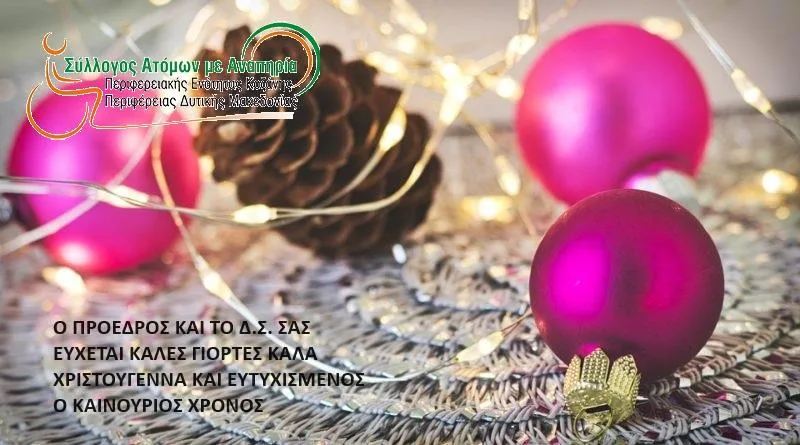 Ο Πρόεδρος και το Δ.Σ. του Συλλόγου Ατόμων με Αναπηρία Περιφερειακής Ενότητας Κοζάνης Περιφέρειας Δυτικής Μακεδονίας σας εύχεται καλές γιορτές, καλά Χριστούγεννα και ευτυχισμένος ο νέος χρόνος!