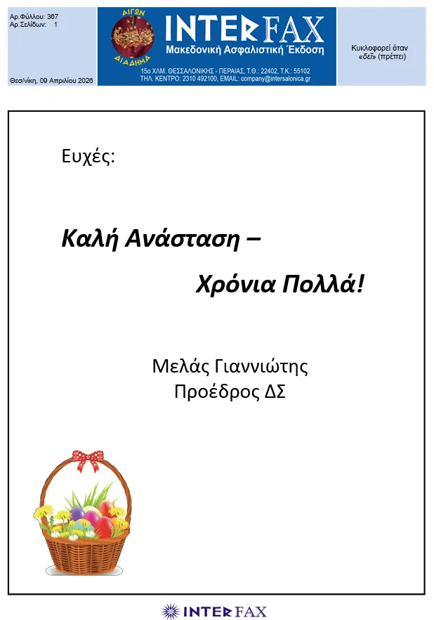 Πασχαλινό μήνυμα με ευχές για Καλή Ανάσταση και Χρόνια Πολλά απευθύνει ο Όμιλος Επιχειρήσεων ΙΝΤΕΡΣΑΛΟΝΙΚΑ. Το μήνυμα υπογράφει ο πρόεδρος του Διοικητικού Συμβουλίου, Μελάς Γιαννιώτης.