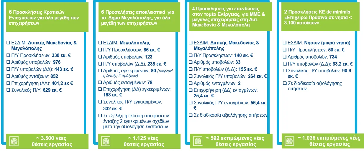 - 6 προσκλήσεις κρατικών ενισχύσεων για όλα τα μεγέθη επιχειρήσεων στη Δυτική Μακεδονία και τη Μεγαλόπολη, προϋπολογισμού 330 εκατ. ευρώ, κινητοποίησαν 976 υποβολές, με 852 πράξεις να προχωρούν σε ένταξη ή να βρίσκονται υπό ένταξη. Η Δημόσια Δαπάνη ανέρχεται σε 401,2 εκατ. ευρώ, με συνολικό προϋπολογισμό έργων 629 εκατ. ευρώ. Οι έξι προσκλήσεις αποκλειστικά για τον Δήμο Μεγαλόπολης (προϋπολογισμός 86 εκατ. ευρώ) κατέγραψαν 123 υποβολές και οδήγησαν σε 80 εγκρίσεις, με Δημόσια Δαπάνη 188 εκατ. ευρώ και συνολικό προϋπολογισμό εγκεκριμένων έργων 332 εκατ. ευρώ.