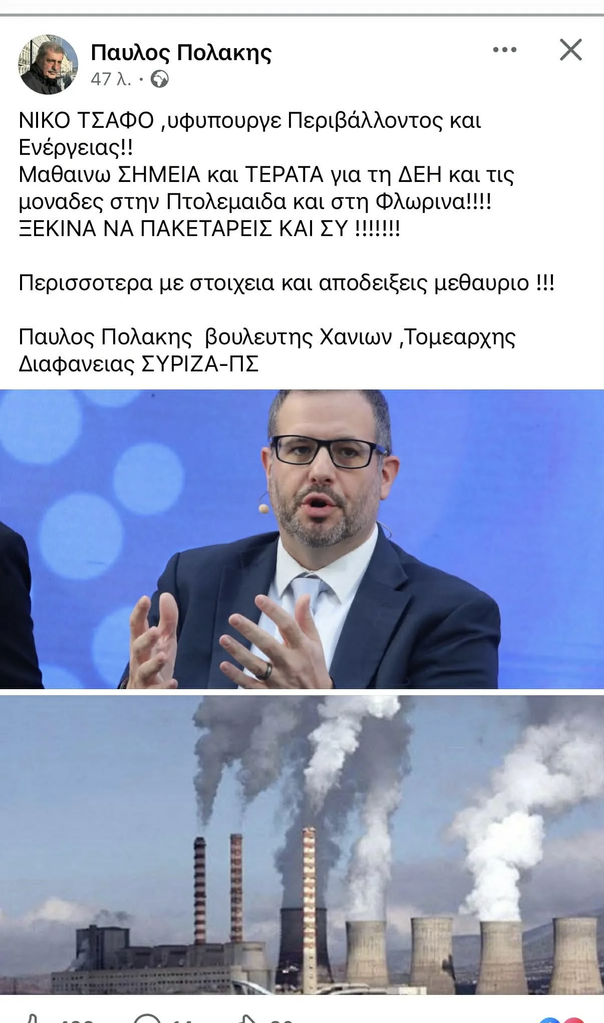 Προειδοποιητικές βολές για αποκαλύψεις σχετικά με τη ΔΕΗ και τις λιγνιτικές μονάδες σε Πτολεμαΐδα και Φλώρινα, ρίχνει με ανάρτησή του στα social media, ο Βουλευτής ΣΥΡΙΖΑ, Παύλος Πολάκης, στρέφοντας τα πυρά του κατά του Υφυπουργού Ενέργειας, Νίκου Τσάφου.