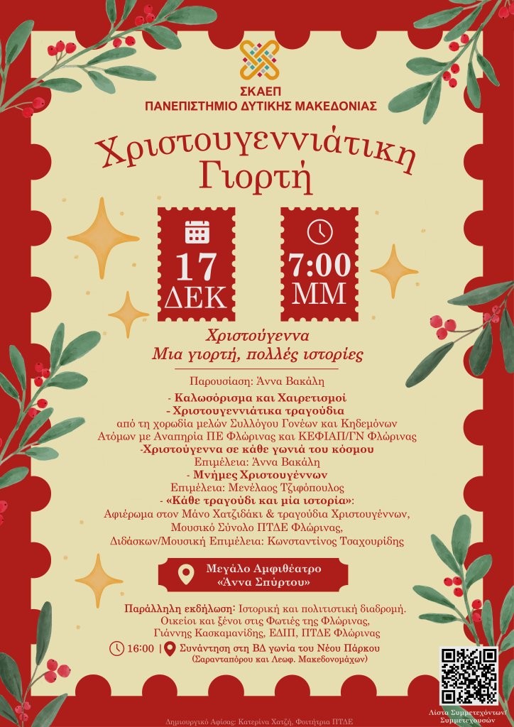 Το ΣΚΑΕΠ / Πανεπιστήμιο Δυτικής Μακεδονίας διοργανώνει στη Φλώρινα τη Χριστουγεννιάτικη Γιορτή με τίτλο «Χριστούγεννα – Μια γιορτή, πολλές ιστορίες», την Τρίτη 17 Δεκεμβρίου στις 19:00, στο Μεγάλο Αμφιθέατρο “Άννα Σπύρτου”.