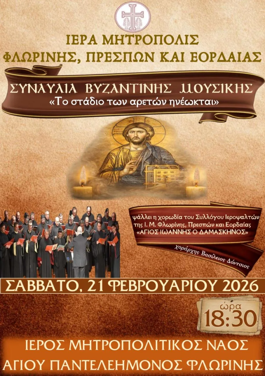 Μια βραδιά αφιερωμένη στους ύμνους του Τριωδίου διοργανώνει η Ιερά Μητρόπολη Φλωρίνης, Πρεσπών και Εορδαίας το Σάββατο 21 Φεβρουαρίου 2026, στον Ιερό Μητροπολιτικό Ναό Αγίου Παντελεήμονος Φλώρινας, προσκαλώντας το κοινό σε μια κατανυκτική μουσική εμπειρία ενόψει της περιόδου της Μεγάλης Τεσσαρακοστής.