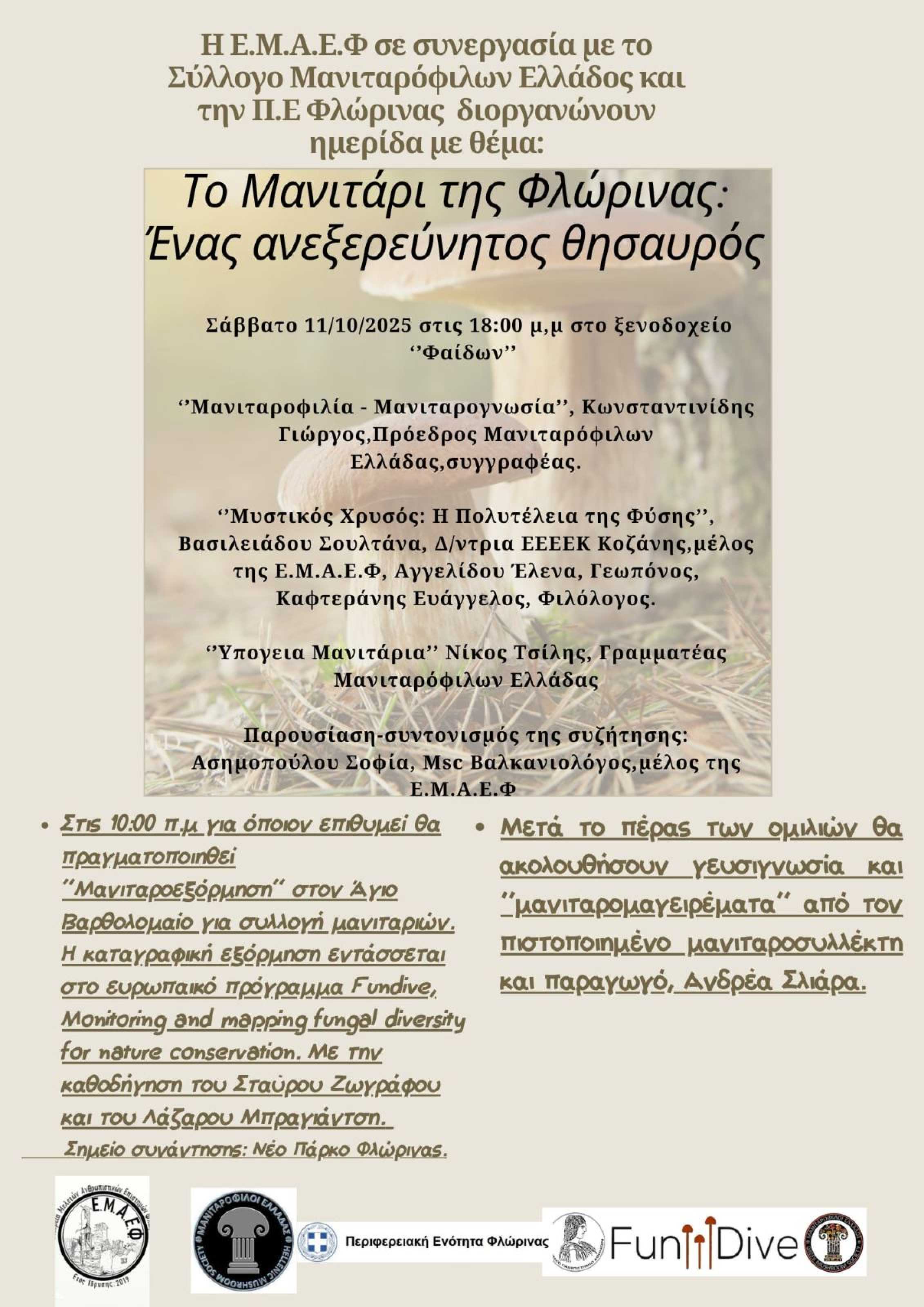 Η πρωτοβουλία υλοποιείται από την Εταιρεία Μελετών Ανθρωπιστικών Επιστημών Φλώρινας (ΕΜΑΕΦ) σε συνεργασία με τον Σύλλογο Μανιταρόφιλων Ελλάδος και την Περιφερειακή Ενότητα Φλώρινας. Στο πρόγραμμα περιλαμβάνονται οι εισηγήσεις: «Μανιταροφιλία – Μανιταρογνωσία» από τον Γιώργο Κωνσταντινίδη, πρόεδρο των Μανιταρόφιλων Ελλάδας και συγγραφέα, «Μυστικός Χρυσός: Η Πολυτέλεια της Φύσης» από τη Σουλτάνα Βασιλειάδου (Δ/ντρια ΕΕΕΕΚ Κοζάνης, μέλος ΕΜΑΕΦ), την Έλενα Αγγελίδου (γεωπόνος) και τον Ευάγγελο Καφτεράνη (φιλόλογο), καθώς και «Υπόγεια Μανιτάρια» από τον Νίκο Τσίλη, γραμματέα των Μανιταρόφιλων Ελλάδας. Την παρουσίαση και τον συντονισμό αναλαμβάνει η Σοφία Ασημοπούλου (MSc Βαλκανιολόγος, μέλος ΕΜΑΕΦ), ενώ μετά το πέρας των ομιλιών θα ακολουθήσουν δειγματισμός/γευσιγνωσία και μανιταρομαγειρέματα από τα μέλη του Συλλόγου Μανιταρόφιλων, με τον πιστοποιημένο μανιταροσυλλέκτη και παραγωγό Ανδρέα Σλιάρα.