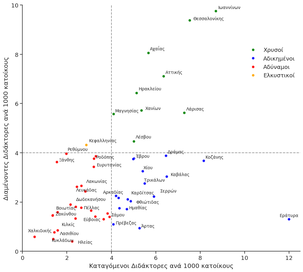 Τέλος, όλως περιέργως, υπάρχει αρνητική συσχέτιση ανάμεσα στην “γέννηση” διδακτόρων και το ανά κεφαλήν διαθέσιμο εισόδημα στις διάφορες Περιφέρειες της χώρας. Δηλαδή, ο πλούτος δεν οδηγεί οπωσδήποτε στην μόρφωση υψηλού επιπέδου. Αν και ίσως είναι Ελληνική ιδιαιτερότητα, τέτοια δείγματα φαίνονται και σε άλλες χώρες. Παγκοσμίως, όμως, ‘ οι διδάκτορες παντρεύονται διδακτόρισσες και γεννούν διδακτοράκια’ και η φτώχια έχει θετική συσχέτιση με την χαμηλή μόρφωση.