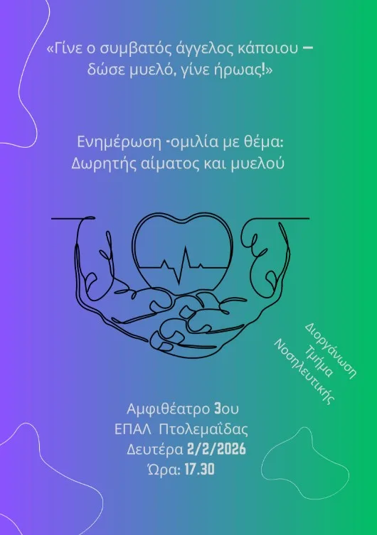 Το Τμήμα Νοσηλευτικής του 3ου ΕΠΑΛ Πτολεμαΐδας διοργανώνει ενημερωτική ημερίδα με θέμα τη δωρεά αίματος και μυελού “Γίνε ο συμβατός άγγελος κάποιου – Δώσε μυελό, γίνε ήρωας!” τη Δευτέρα 2 Φεβρουαρίου 2026 και ώρα 17:30 στο Αμφιθέατρο του Σχολείο.
