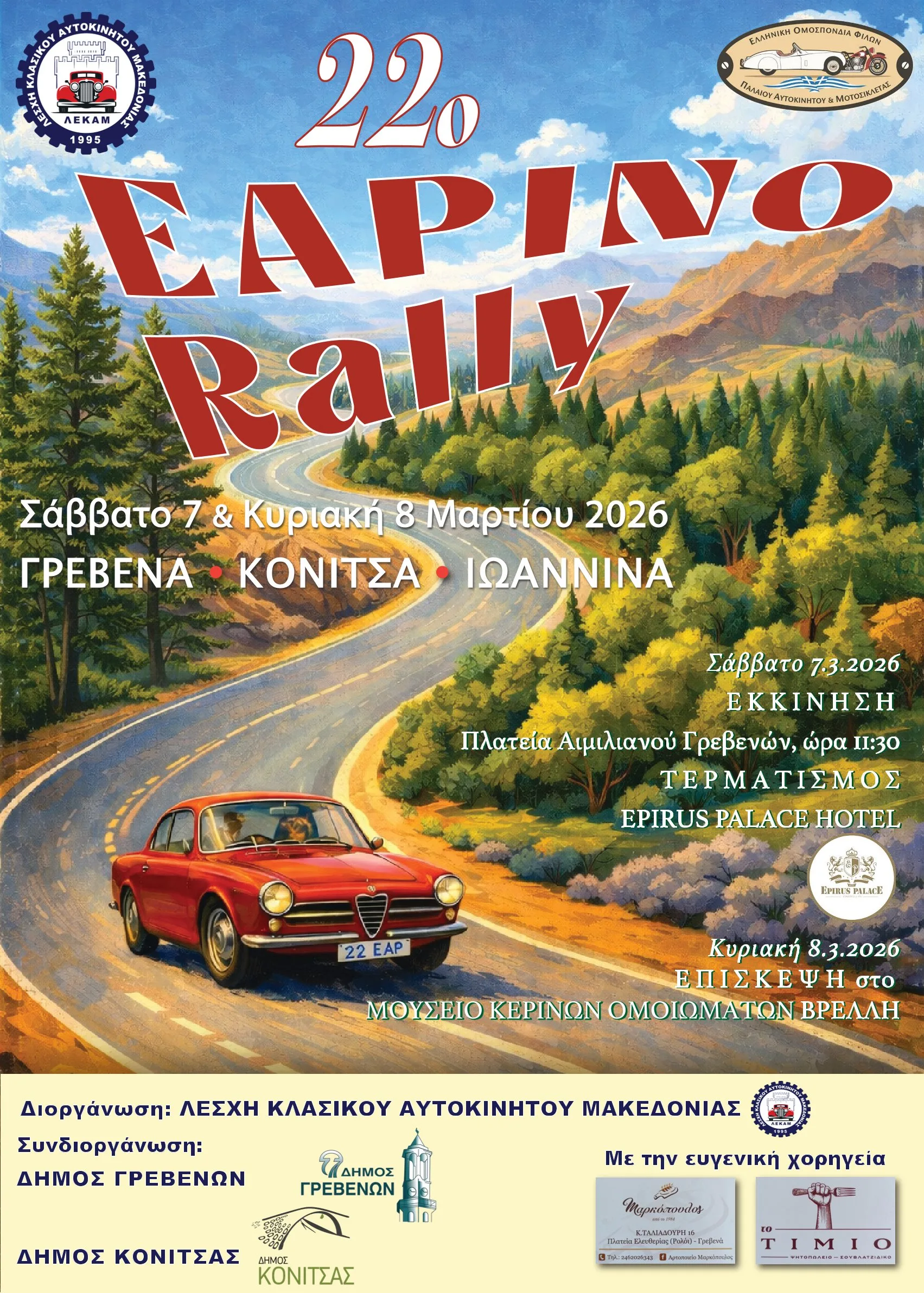 Κλασικά αυτοκίνητα θα κατακλύσουν την Κεντρική Πλατεία των Γρεβενών το Σάββατο 7 Μαρτίου, καθώς από εκεί θα δοθεί η εκκίνηση για το 22ο Εαρινό Ράλι που διοργανώνει η Λέσχη Κλασικού Αυτοκινήτου Μακεδονίας.