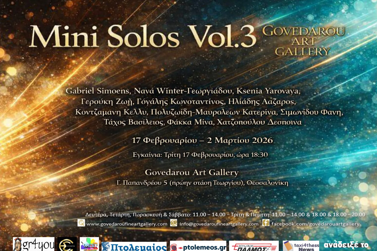 Η Govedarou Art Gallery παρουσιάζει στο χώρο της στη Γεωργίου Παπανδρέου 5 (πρώην Ανθέων), την εικαστική έκθεση με τίτλο: “MINI SOLOS Vol.3”, την επιμέλεια της οποίας φέρει η εικαστικός και ιδιοκτήτρια της γκαλερί Νατάσα Γκοβεδάρου. Τα εγκαίνια της έκθεσης θα γίνουν την Τρίτη 17 Φεβρουαρίου 2026, ώρα 18.30 και θα διαρκέσει μέχρι 2 Μαρτίου.