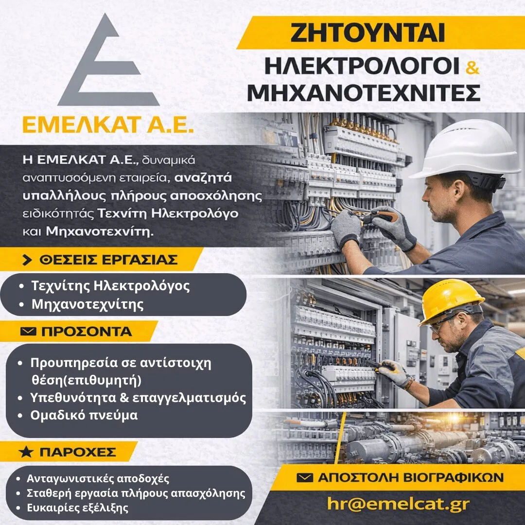 Η ΕΜΕΛΚΑΤ Α.Ε. αναζητά υπαλλήλους πλήρους απασχόλησης ειδικότητας Τεχνίτη Ηλεκτρολόγο και Μηχανοτεχνίτη.