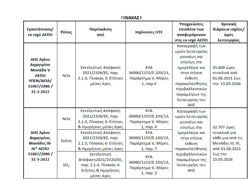 Δημοσιεύθηκε στη ΔΙΑΥΓΕΙΑ στις 30/12 η απόφαση του Υπουργείου Περιβάλλοντος και Ενέργειας για την παράταση λειτουργίας των Λιγνιτικών Μονάδων ΙΙΙ-IV,V του ΑΗΣ Αγίου Δημητρίου, μέχρι και τις 15/5/2026.
