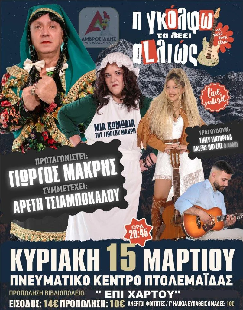 Η θεατρική παράσταση «Η Γκολφώ τα λέει αλλιώς» παρουσιάζεται την Κυριακή 15 Μαρτίου στο Πνευματικό Κέντρο Πτολεμαΐδας, με ώρα έναρξης 20:45 και προσέλευση από τις 20:00.