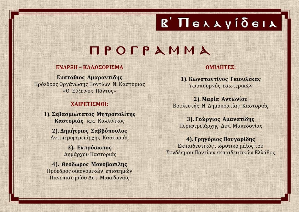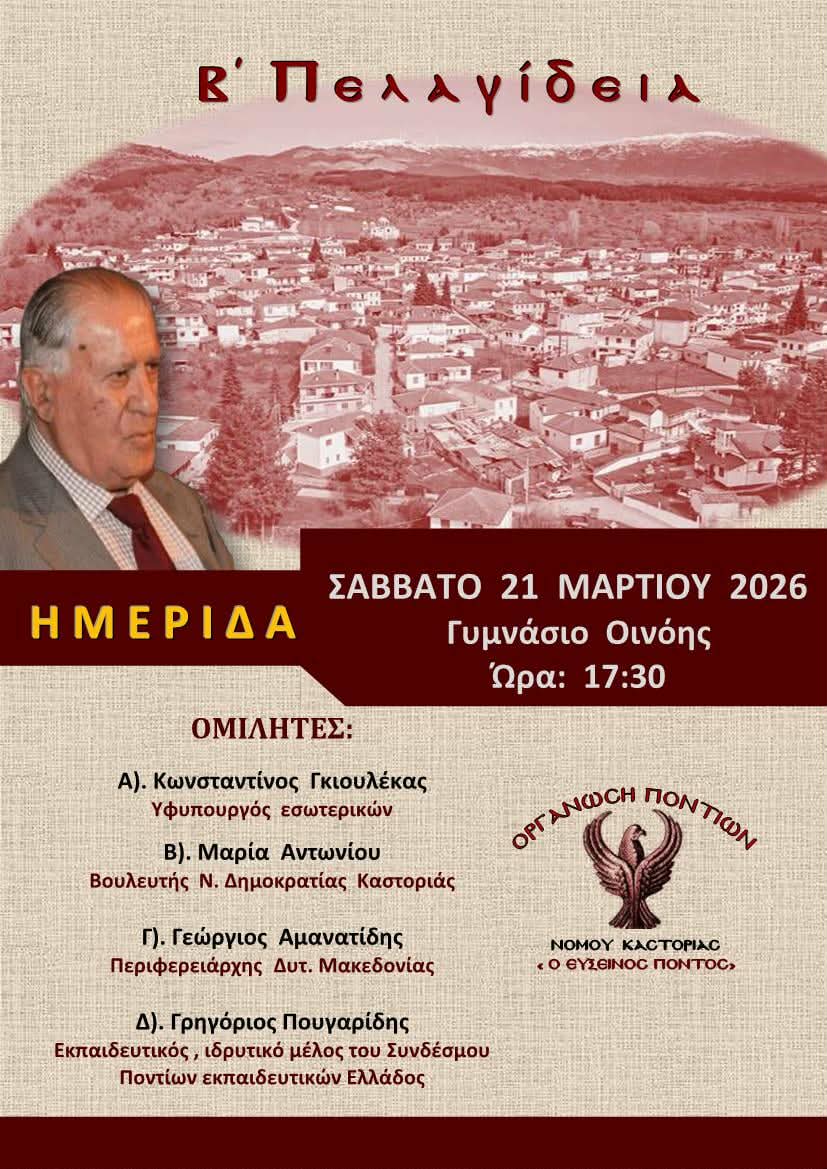 Η Οργάνωση Ποντίων Ν. Καστοριάς «Ο Εύξεινος Πόντος» σας προσκαλεί να τιμήσετε με την παρουσία σας την Ημερίδα «Β’ Πελαγίδεια» που θα λάβει χώρα στο Γυμνάσιο Οινόης Καστοριάς το Σάββατο 21 Μαρτίου 2026 και ώρα 17:30.