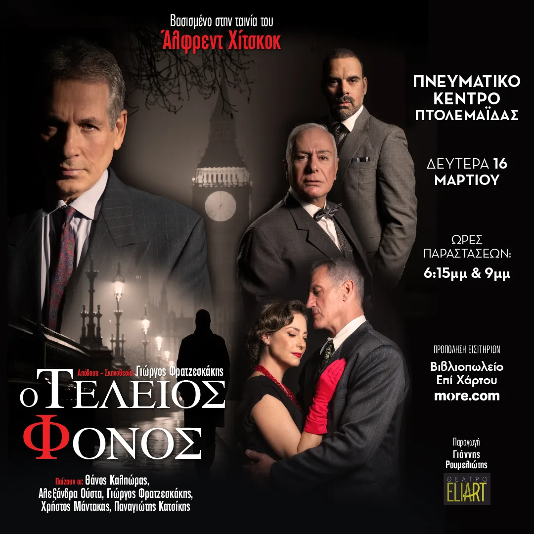 Το αριστοτεχνικό αστυνομικό θρίλερ του Φρέντερικ Νοτ, «Ο Τέλειος Φόνος», που έγινε παγκοσμίως γνωστό μέσα από τη θρυλική κινηματογραφική μεταφορά του Άλφρεντ Χίτσκοκ «Dial M for Murder», παρουσιάζεται στο Πνευματικό Κέντρο Πτολεμαΐδας, σε σκηνοθεσία Γιώργου Φρατζεσκάκη.
