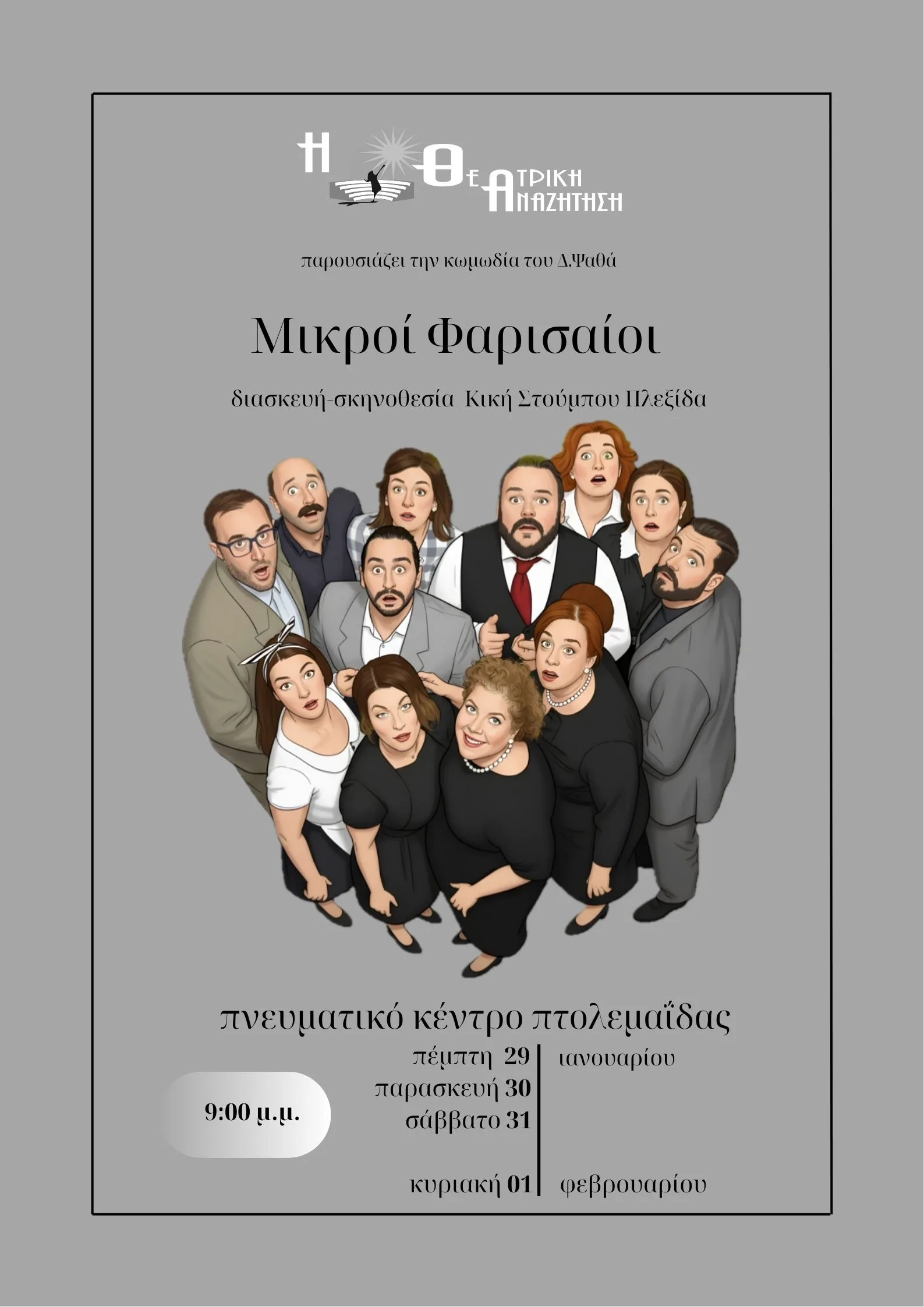 Στην Πτολεμαΐδα φιλοξενείται τις τελευταίες ημέρες του Ιανουαρίου και τις αρχές Φεβρουαρίου η θεατρική παράσταση «Μικροί Φαρισαίοι» του Δημήτρη Ψαθά, σε διασκευή και σκηνοθεσία της Κικής Στούμπου, από τη Θεατρική Αναζήτηση. Οι παραστάσεις θα δοθούν στο Πνευματικό Κέντρο Πτολεμαΐδας την Πέμπτη 29, την Παρασκευή 30 και το Σάββατο 31 Ιανουαρίου, καθώς και την Κυριακή 1 Φεβρουαρίου, με ώρα έναρξης στις 21:00.