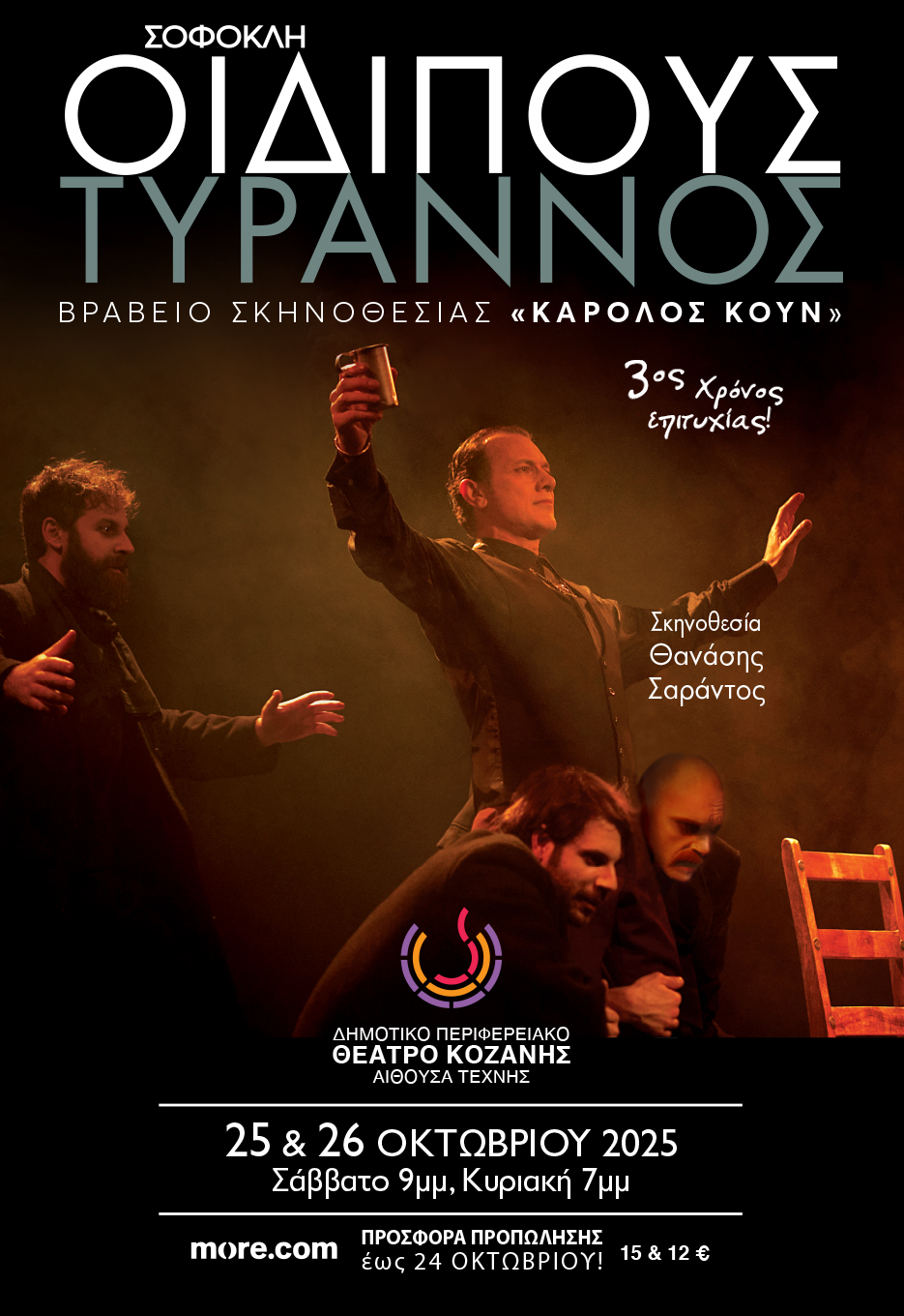 Η βραβευμένη παράσταση ΟΙΔΙΠΟΥΣ ΤΥΡΑΝΝΟΣ του Σοφοκλή σε σκηνοθεσία Θανάση Σαράντου (βραβείο σκηνοθεσίας ΚΑΡΟΛΟΣ ΚΟΥΝ 2024) έρχεται για 2 μόνο παραστάσεις στην Κοζάνη στις 25 και 26 Οκτωβρίου στην Αίθουσα Τέχνης – ΔΗ.ΠΕ.ΘΕ. Κοζάνης. Ώρα έναρξης το Σάββατο στις 21.00 και την Κυριακή στις 19.00.