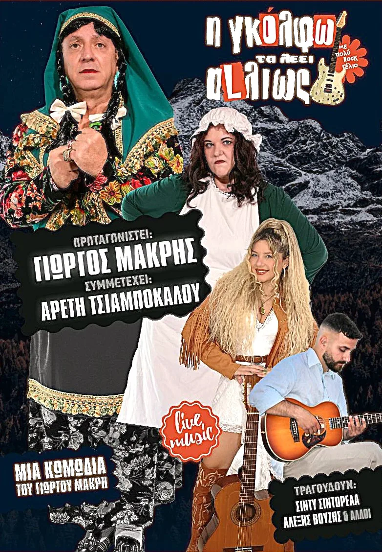 Η παράδοση συναντά το σήμερα σε μια δυναμική, σύγχρονη θεατρική εμπειρία που ξεφεύγει από τα συνηθισμένα. Η Γκόλφω επιστρέφει αλλιώς — πιο ζωντανή, πιο τολμηρή και απόλυτα διαδραστική, σε μια παράσταση όπου ο θεατής γίνεται μέρος της δράσης. Με ρυθμό stand up, ζωντανή μουσική από τις δεκαετίες των 60’s, 70’s και 80’s και έντονη μπουάτ ατμόσφαιρα, το τότε συναντά το τώρα σε δύο ώρες γέλιου, τραγουδιού και αυθεντικής διασκέδασης.