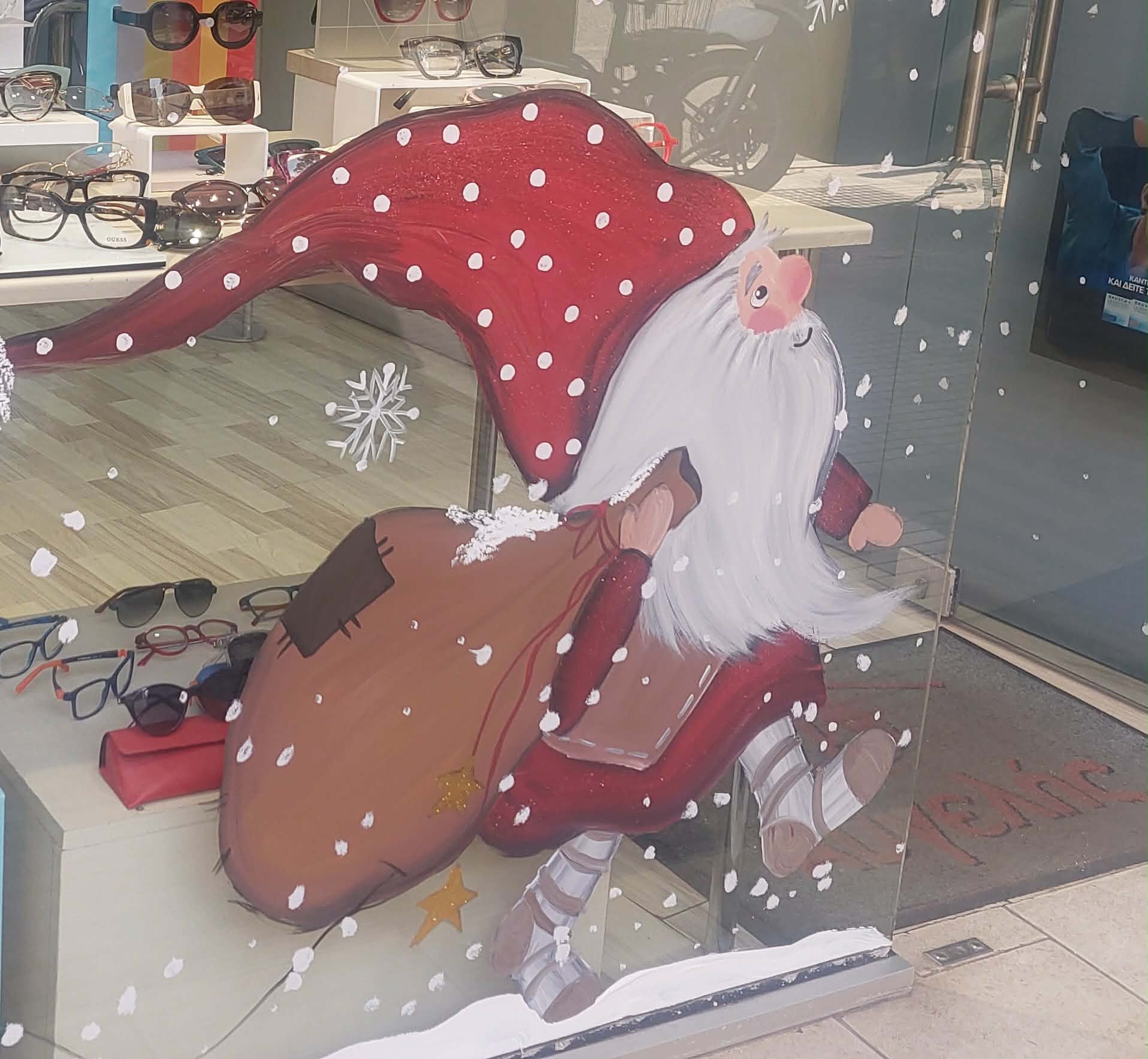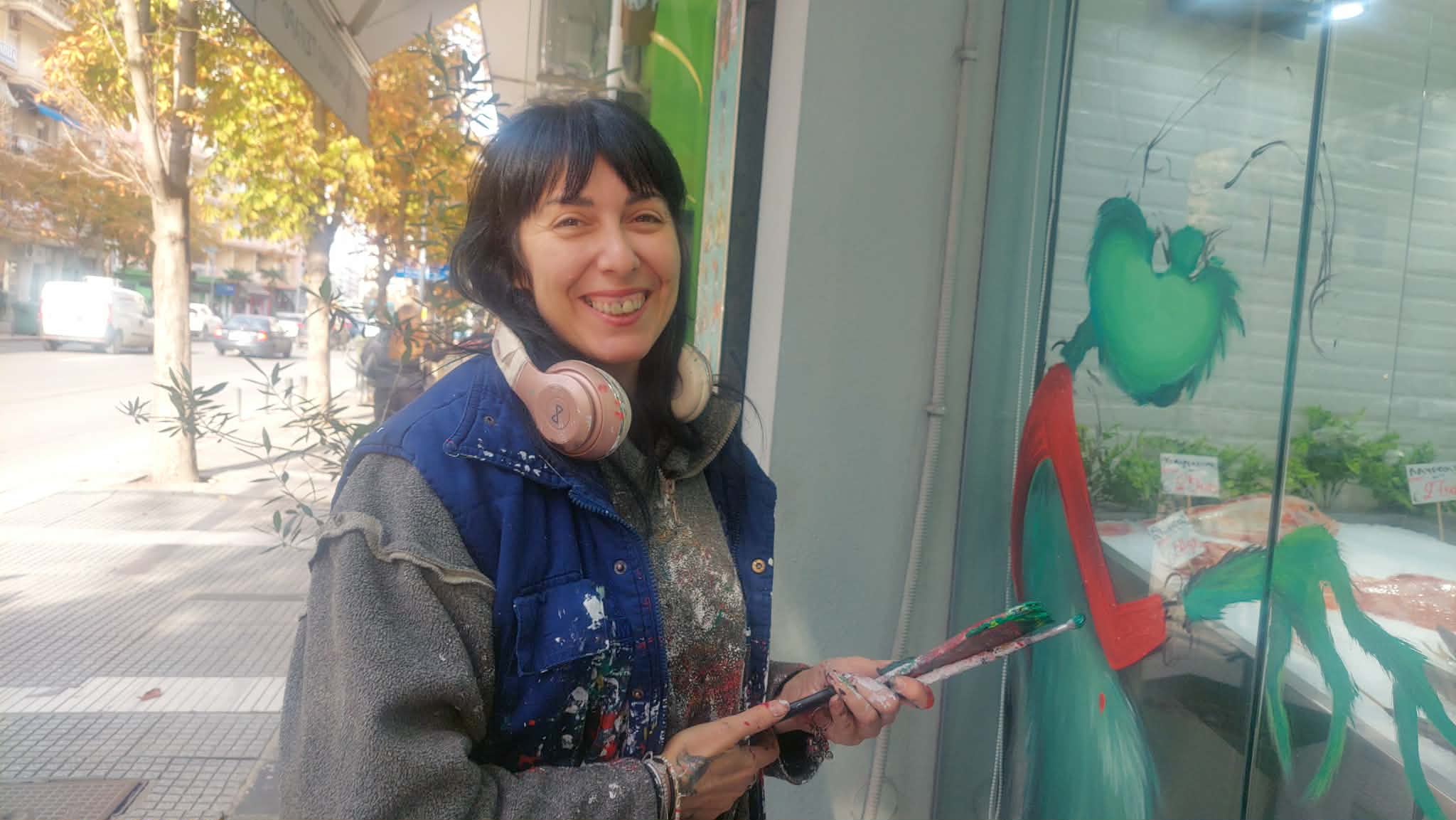 Σε ένα πολυσύχναστο δρόμο της Θεσσαλονίκης συναντήσαμε επί του έργου , μία πλανόδια εικαστικό την γλυκιά Ελένη ,που μεταμόρφωσε κάποιες βιτρίνες καταστημάτων με υπέροχες θεματικές φιγούρες, επίκαιρες δημιουργίες και παραμυθένια γιορτινά τοπία. Την πλησιάσαμε παρατηρώντας την να ζωγραφίζει με διάθεση και μεράκι και της ζητήσαμε να μας πει κάποια πράγματα για την Τέχνη της και τα υλικά που χρησιμοποιεί .