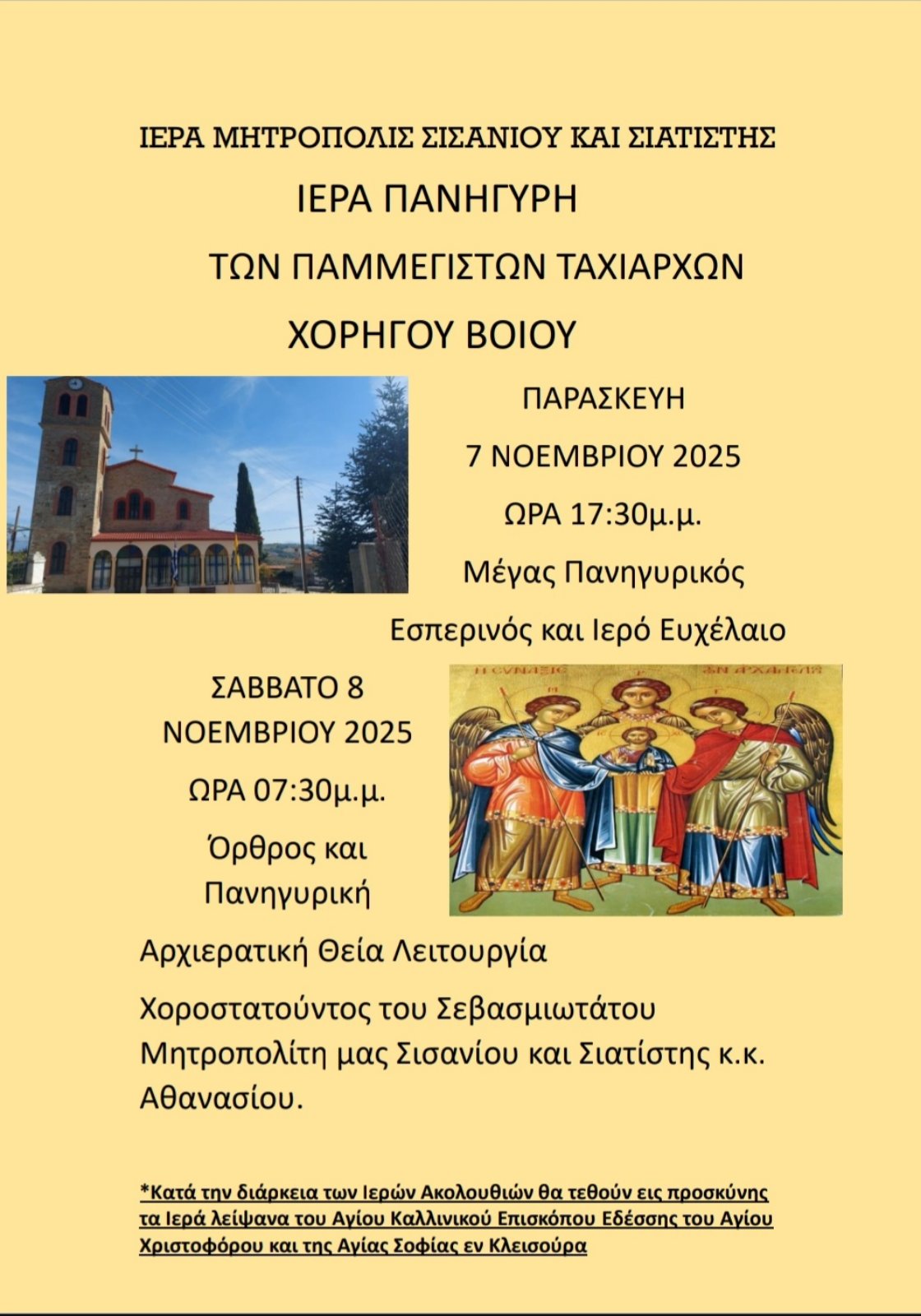 Η Ιερά Μητρόπολη Σισανίου και Σιατίστης εορτάζει την ιερά πανήγυρη των Παμμεγίστων Ταξιαρχών στο Χορηγό Βοΐου με την τέλεση των παρακάτω ακολουθιών: