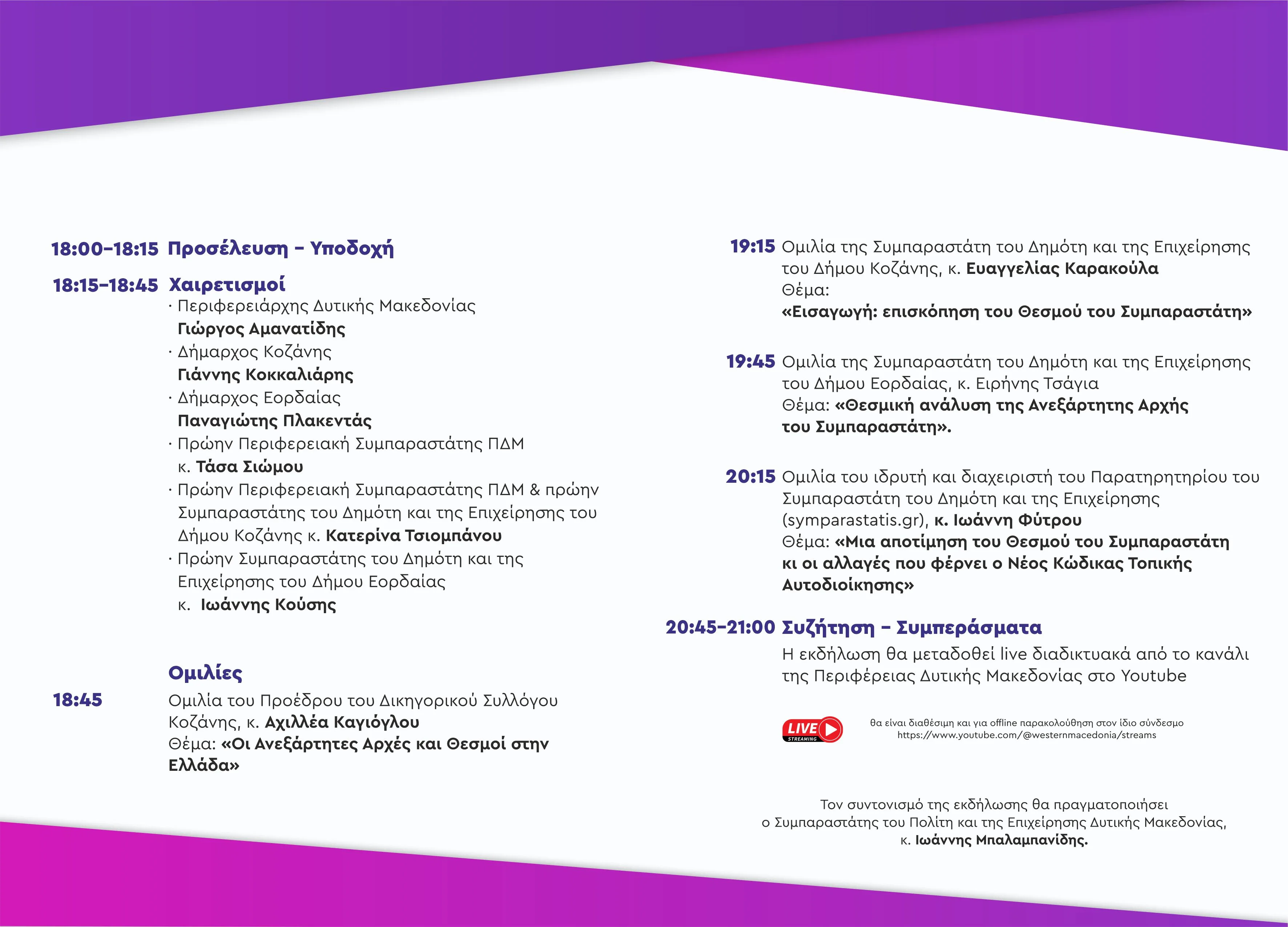 Ημερίδα παρουσίασης του θεσμού του Συμπαραστάτη του πολίτη/δημότη και της επιχείρησης θα πραγματοποιηθεί σήμερα Τετάρτη 25/2 και ώρα 18:00 στην Αίθουσα Συνεδριάσεων Περιφερειακού Συμβουλίου Δυτικής Μακεδονίας.