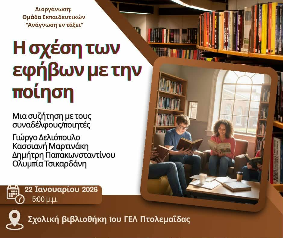Την Κασσιανή Μαρτινάκη, εκπαιδευτικό και ποιήτρια, φιλοξένησε η εκπομπή «ΡΑΔΙΟΕΦΗΜΕΡΙΔΑ» με την Αναστασία Κοτζακόλιου, σε μια συζήτηση αφιερωμένη στην ποίηση και τη σχέση της με τους εφήβους. Η ραδιοφωνική συνέντευξη πραγματοποιήθηκε με αφορμή την εκδήλωση «Η σχέση των εφήβων με την ποίηση», που θα φιλοξενηθεί στη σχολική βιβλιοθήκη του ΓΕΛ Πτολεμαΐδας, και αποτέλεσε μια ευκαιρία να τεθούν στο προσκήνιο ερωτήματα γύρω από τη θέση της ποίησης στη σύγχρονη εκπαιδευτική διαδικασία.