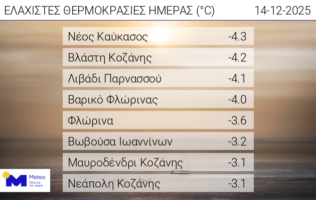 Σε συνθήκες έντονου ψύχους ξύπνησαν σήμερα αρκετές περιοχές της Δυτικής Μακεδονίας, σύμφωνα με τα στοιχεία καταγραφής ελάχιστων θερμοκρασιών από το meteo.gr. Η χαμηλότερη θερμοκρασία σημειώθηκε στον Νέο Καύκασο, όπου το θερμόμετρο έδειξε -4,3°C. Ακολούθησαν η Βλάστη Κοζάνης με -4,2°C και το Λιβάδι Παρνασσού με -4,1°C, ενώ στη Βαρυκό Φλώρινας καταγράφηκαν -4,0°C. Στην πόλη της Φλώρινας η ελάχιστη θερμοκρασία έφτασε τους -3,6°C.