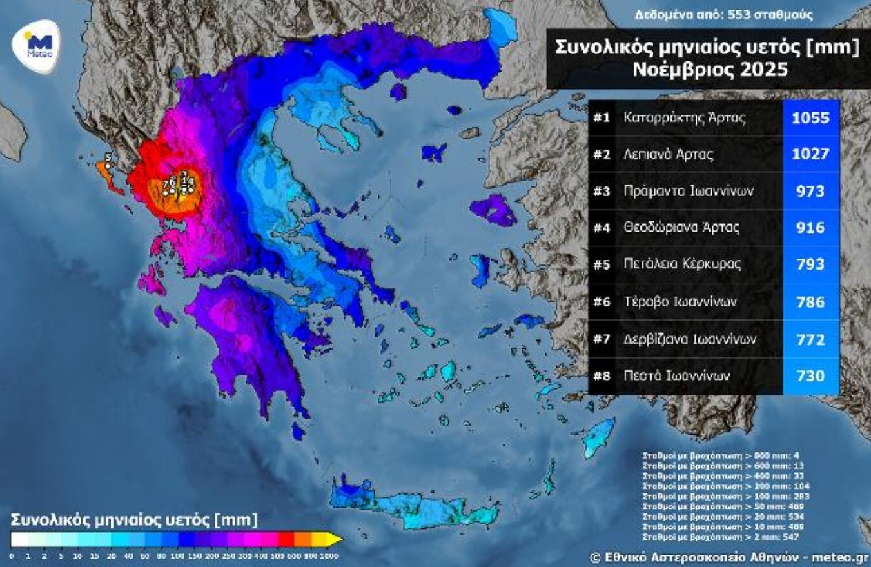 Εξαιρετικά μεγάλα ύψη βροχής καταγράφηκαν στην Ήπειρο και πιο συγκεκριμένα στην ορεινή ζώνη των Τζουμέρκων, όπου τα καταγεγραμμένα ύψη υπερέβησαν τα 1000 χιλιοστά μέσα σε έναν μήνα. Οι μηνιαίες τιμές βροχόπτωσης του Νοεμβρίου 2025 στον Καταρράκτη και στα Λεπιανά Άρτας συγκαταλέγονται στα δέκα μεγαλύτερα μηνιαία ύψη βροχής που έχουν καταγραφεί από την έναρξη λειτουργίας του δικτύου αυτόματων μετεωρολογικών σταθμών του meteo.gr / Εθνικού Αστεροσκοπείου Αθηνών. Τα δέκα μεγαλύτερα μηνιαία ύψη βροχής εμφανίζονται κυρίως σε τρεις περιόδους με έντονα καιρικά φαινόμενα: τον Φεβρουάριο 2019 (κακοκαιρίες Χιόνη και Ωκεανίς), τον Σεπτέμβριο 2023 (κακοκαιρίες Daniel και Ηλίας) και τον Νοέμβριο 2025 (κακοκαιρία 18-22/11 και κακοκαιρία Adel).