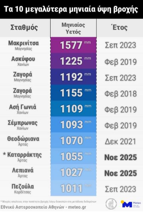 Εικόνα 2. Τα 10 μεγαλύτερα μηνιαία ύψη βροχής από το δίκτυο αυτόματων μετεωρολογικών σταθμών του meteo.gr / Εθνικού Αστεροσκοπείου Αθηνών.