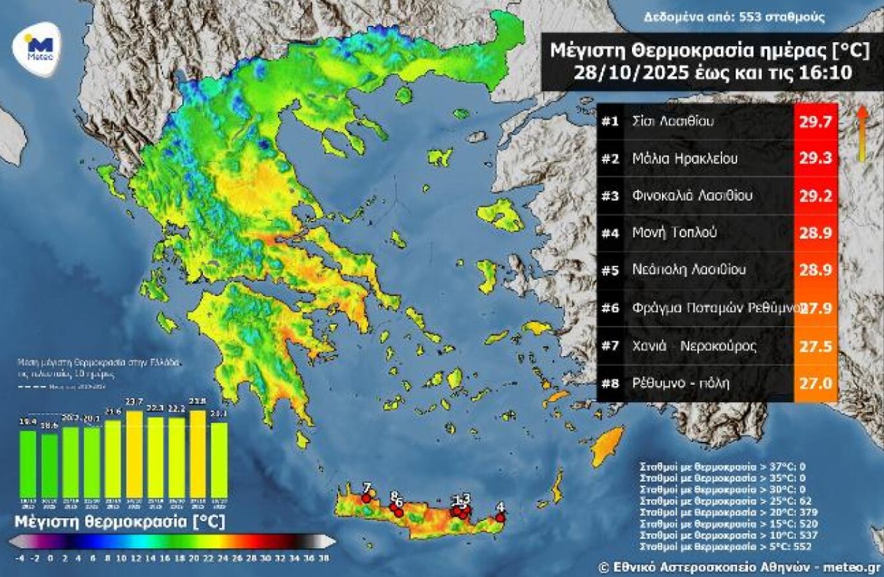 Με υψηλές θερμοκρασίες πραγματοποιήθηκε ο εορτασμός της Εθνικής Επετείου της 28ης Οκτωβρίου. Οι υψηλότερες μέγιστες σημειώθηκαν στη Βόρεια Κρήτη όπου ο υδράργυρος πλησίασε τους 30 °C.