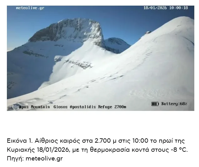 Χαρακτηριστικές είναι οι εικόνες από το Οροπέδιο των Μουσών και την κάμερα καιρού του meteolive.gr, σε υψόμετρο περίπου 2700 μέτρων, όπου επικρατεί απόλυτη διαύγεια, σε πλήρη αντίθεση με τις συνθήκες έντονης χιονόπτωσης που καταγράφονταν την ίδια ώρα σε χαμηλότερα υψόμετρα.