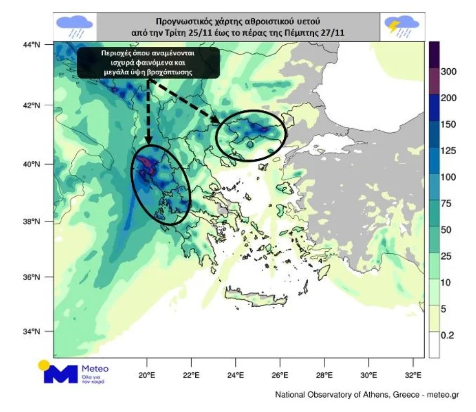 Την Παρασκευή (28/11) ισχυρές βροχές και καταιγίδες προβλέπονται σε κεντρική και ανατολική Μακεδονία, Θράκη, ανατολικό Αιγαίο και μέχρι νωρίς το πρωί στη δυτική Ελλάδα».