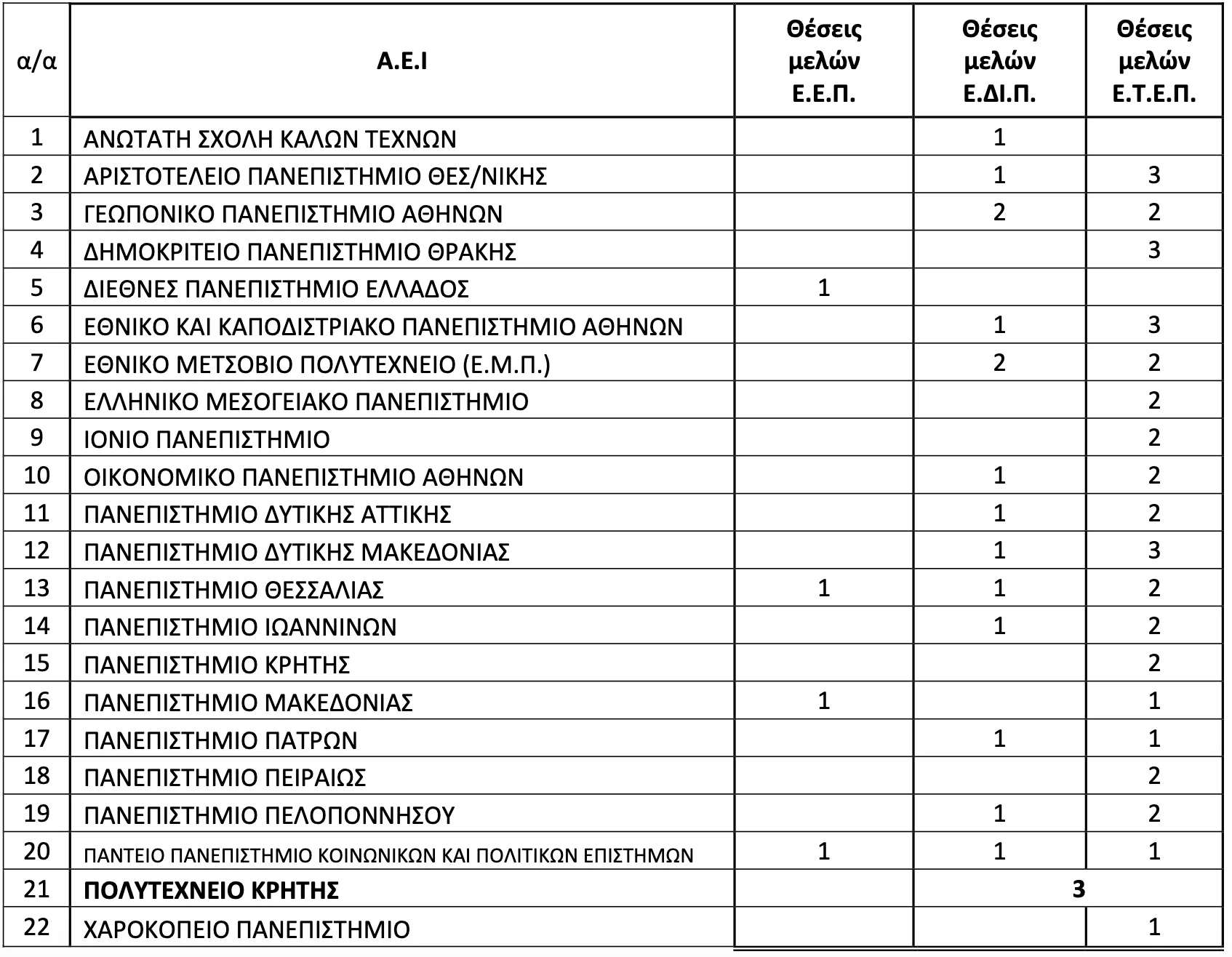 Την κατανομή συνολικά 60 θέσεων για την πρόσληψη μελών Ε.Ε.Π., Ε.ΔΙ.Π. και Ε.Τ.Ε.Π. , για το έτος 2026, στα Ανώτατα Εκαιδευτικά Ιδρύματα, προβλέπει απόφαση της υπουργού Παιδείας Σοφίας Ζαχαράκη.