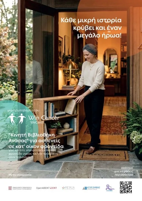 Η «Κινητή Βιβλιοθήκη Ανάσας», μια νέα κοινωνική δράση για ασθενείς σε κατ’ οίκον φροντίδα, ανακοινώνεται από το Εθνικό Κέντρο Τεκμηρίωσης και Ηλεκτρονικού Περιεχομένου (ΕΚΤ), το WinCancer, το Γενικό Αντικαρκινικό-Ογκολογικό Νοσοκομείο Αθηνών «Ο Άγιος Σάββας» και το Γενικό Αντικαρκινικό Νοσοκομείο Πειραιά «Μεταξά».