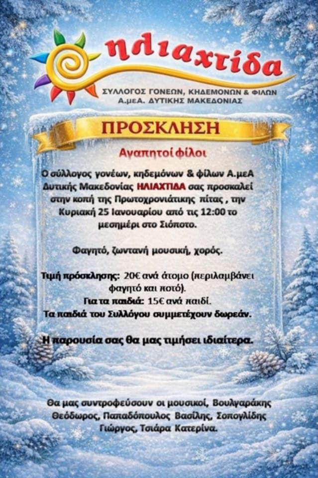 Ο Σύλλογος Γονέων, Κηδεμόνων & Φίλων Α.μεΑ. Δυτικής Μακεδονίας ΗΛΙΑΧΤΙΔΑ σας προσκαλεί στην κοπή της Πρωτοχρονιάτικης πίτας, την Κυριακή 25 Ιανουαρίου από τις 12:00 το μεσημέρι στο Σιόποτο.