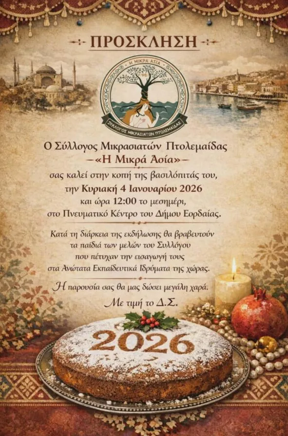 Ο Σύλλογος Μικρασιατών Πτολεμαΐδας σας προσκαλεί στην κοπή βασιλόπιτας που θα γίνει την Κυριακή 4 Ιανουαρίου 2026 και ώρα 12 το μεσημέρι στο Πνευματικό κέντρο του Δήμου Εορδαίας. Στην τελετή θα βραβευθούν τα παιδιά των μελών του Συλλόγου που πέτυχαν την εισαγωγή τους στα Ανώτατα εκπαιδευτικά ιδρύματα το 2025. Την εκδήλωση θα πλαισιώσουν η χορωδία και τα χορευτικά του Συλλόγου.