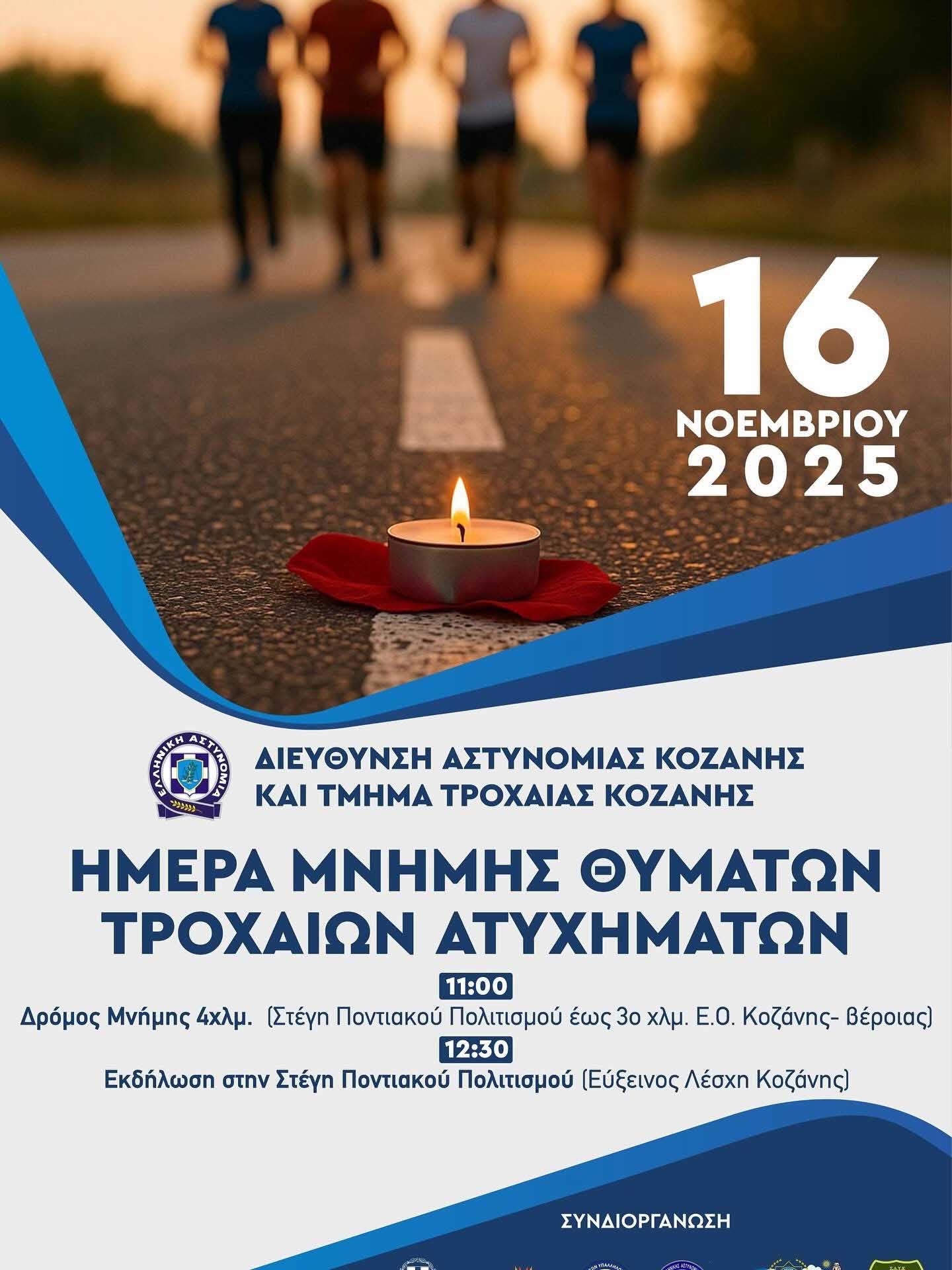 Την Παγκόσμια Ημέρα Μνήμης Θυμάτων Τροχαίων Ατυχημάτων τιμούν για τρίτη συνεχόμενη χρονιά η Διεύθυνση Αστυνομίας Κοζάνης, το Τμήμα Τροχαίας Κοζάνης και η Ένωση Αστυνομικών Υπαλλήλων Κοζάνης, διοργανώνοντας σειρά εκδηλώσεων με τίτλο «Δρόμοι Ασφαλείς για Όλους».